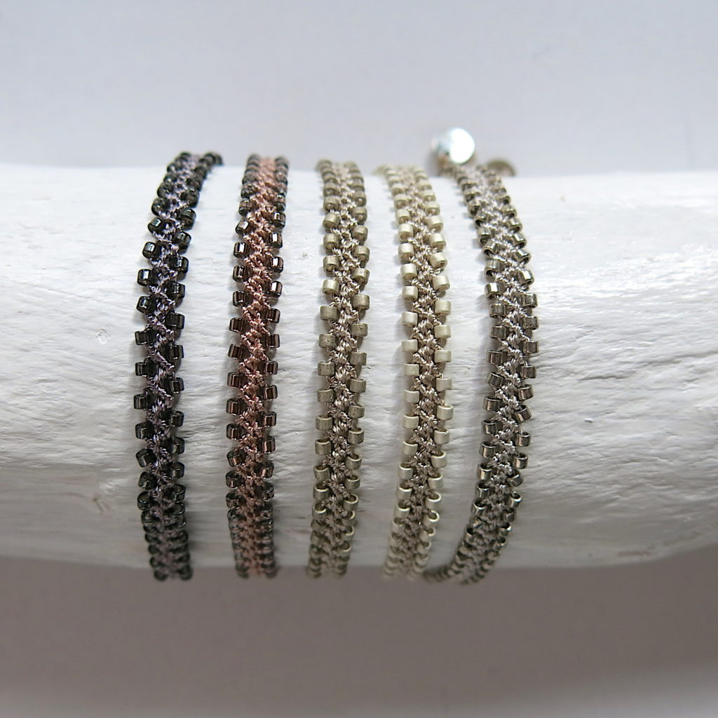 Gedrehtes Häkel Armband mit metallic schimmernden Glasperlen