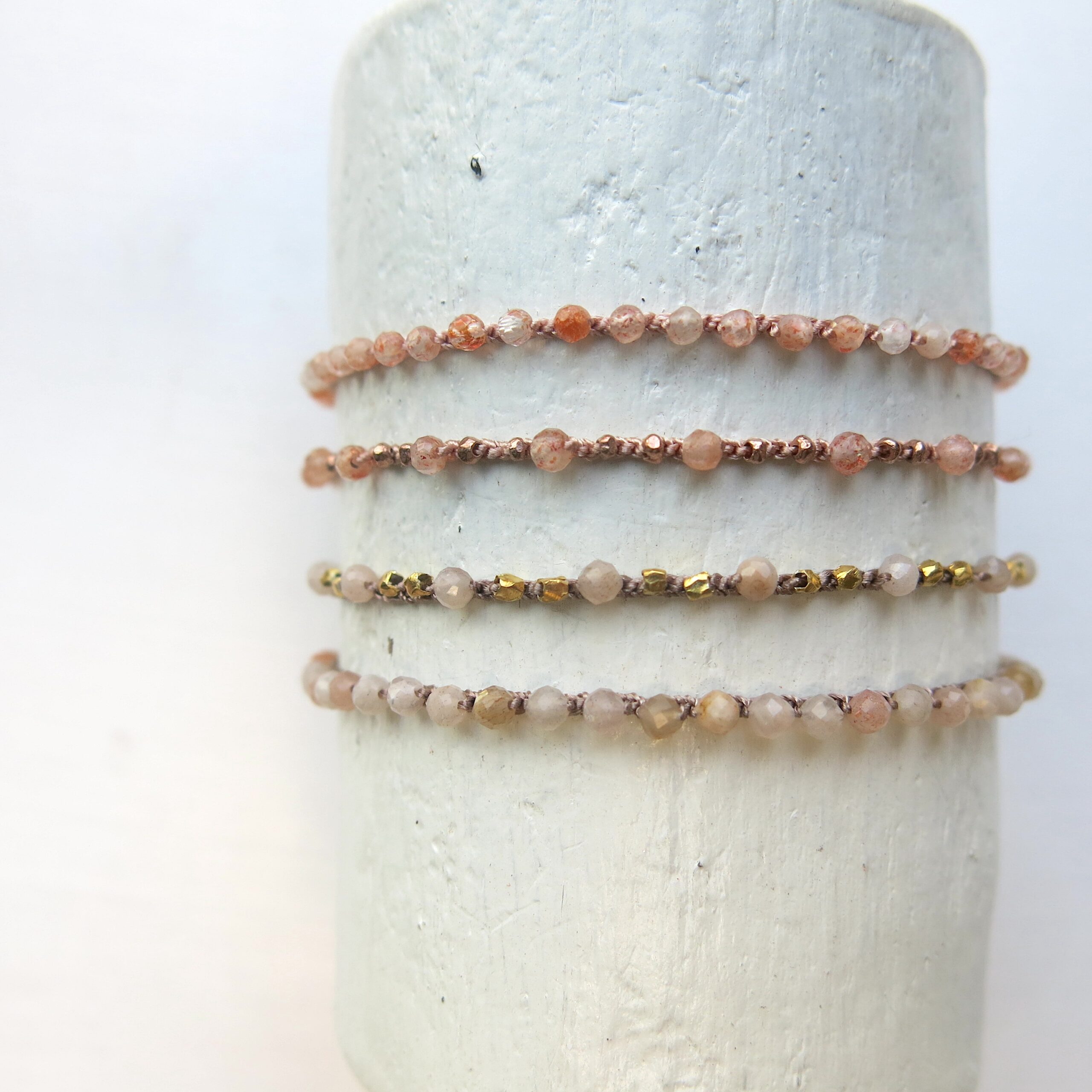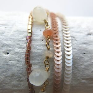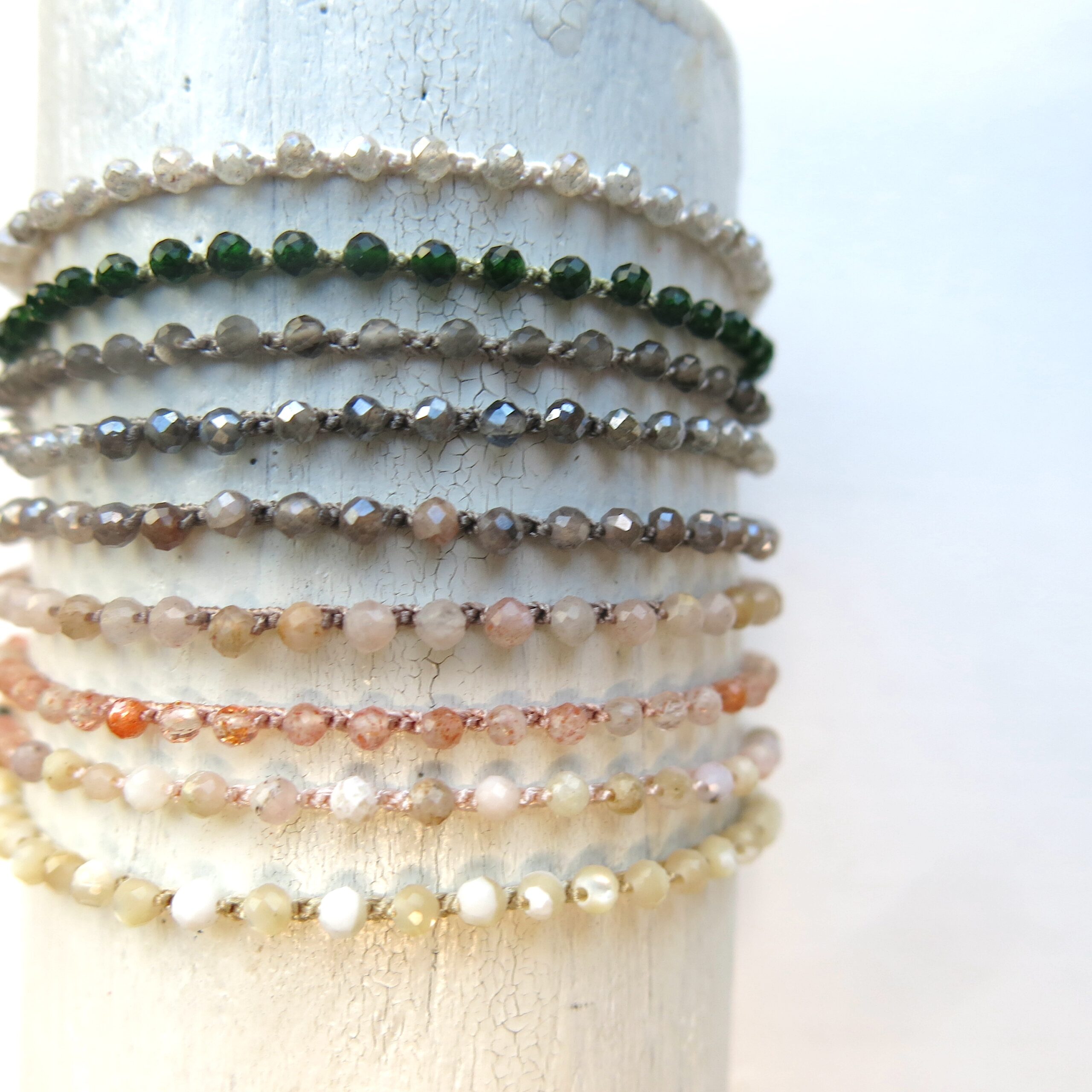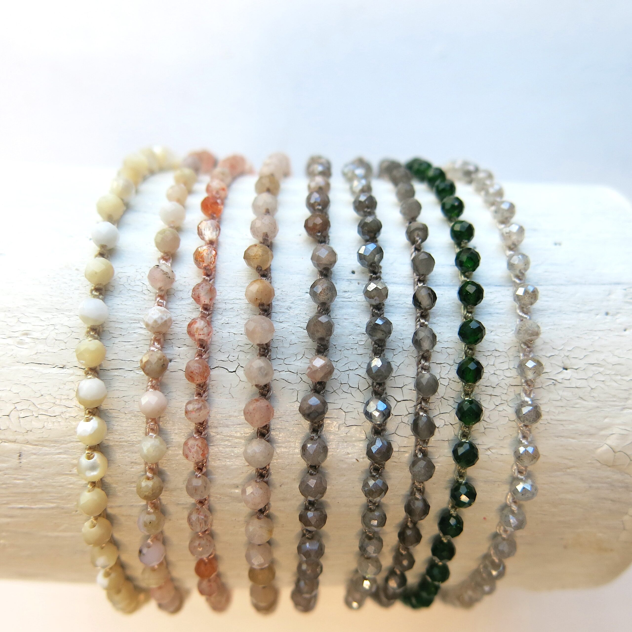 Produktbild von oben nach unten: Silberit, grüner Sandstein, golden Obsidian, Mondstein Taupe in zwei Garnvarianten, Sunstone in zwei Garnvarianten, Rosa Opal & ‚mother of pearl‘ (Perlmutt).