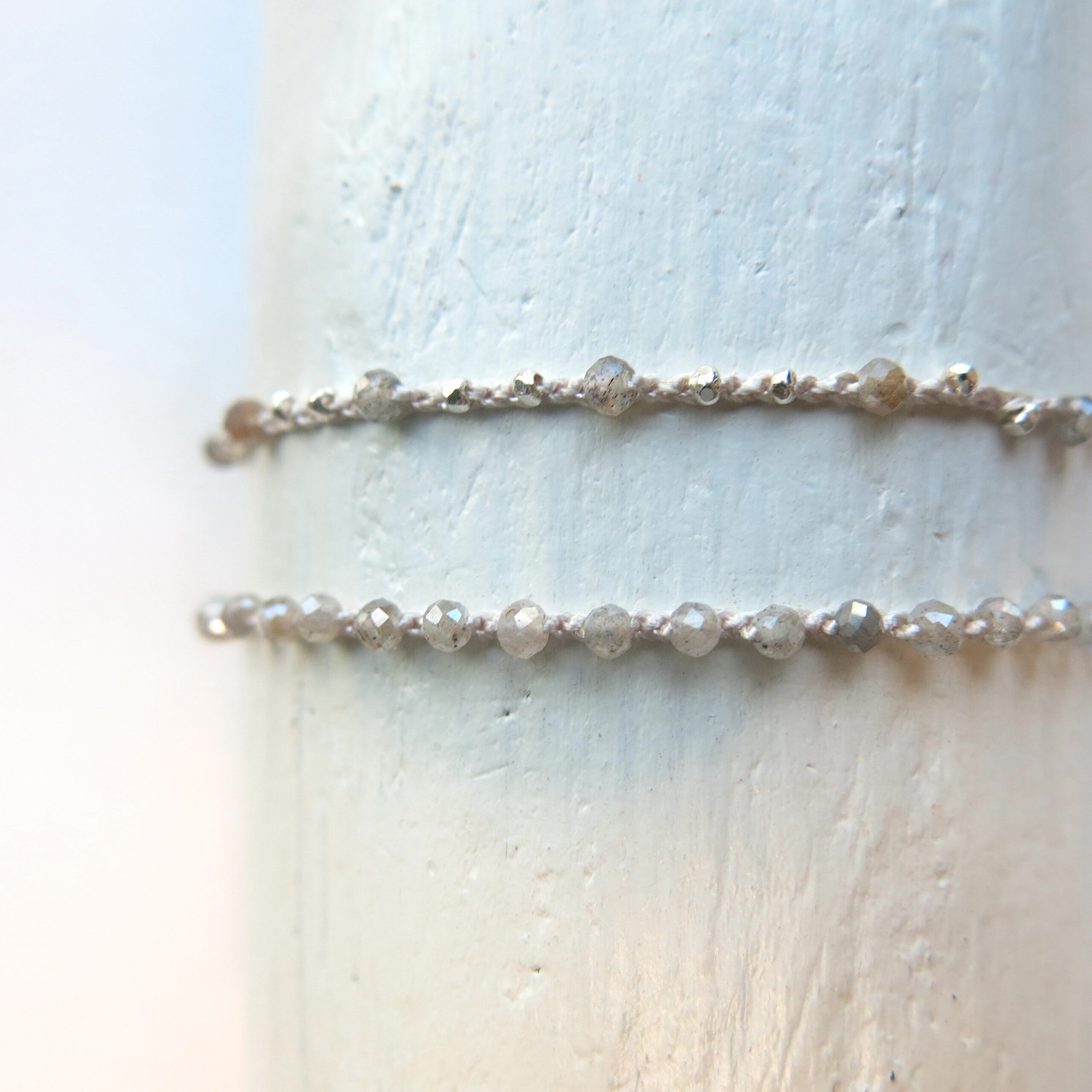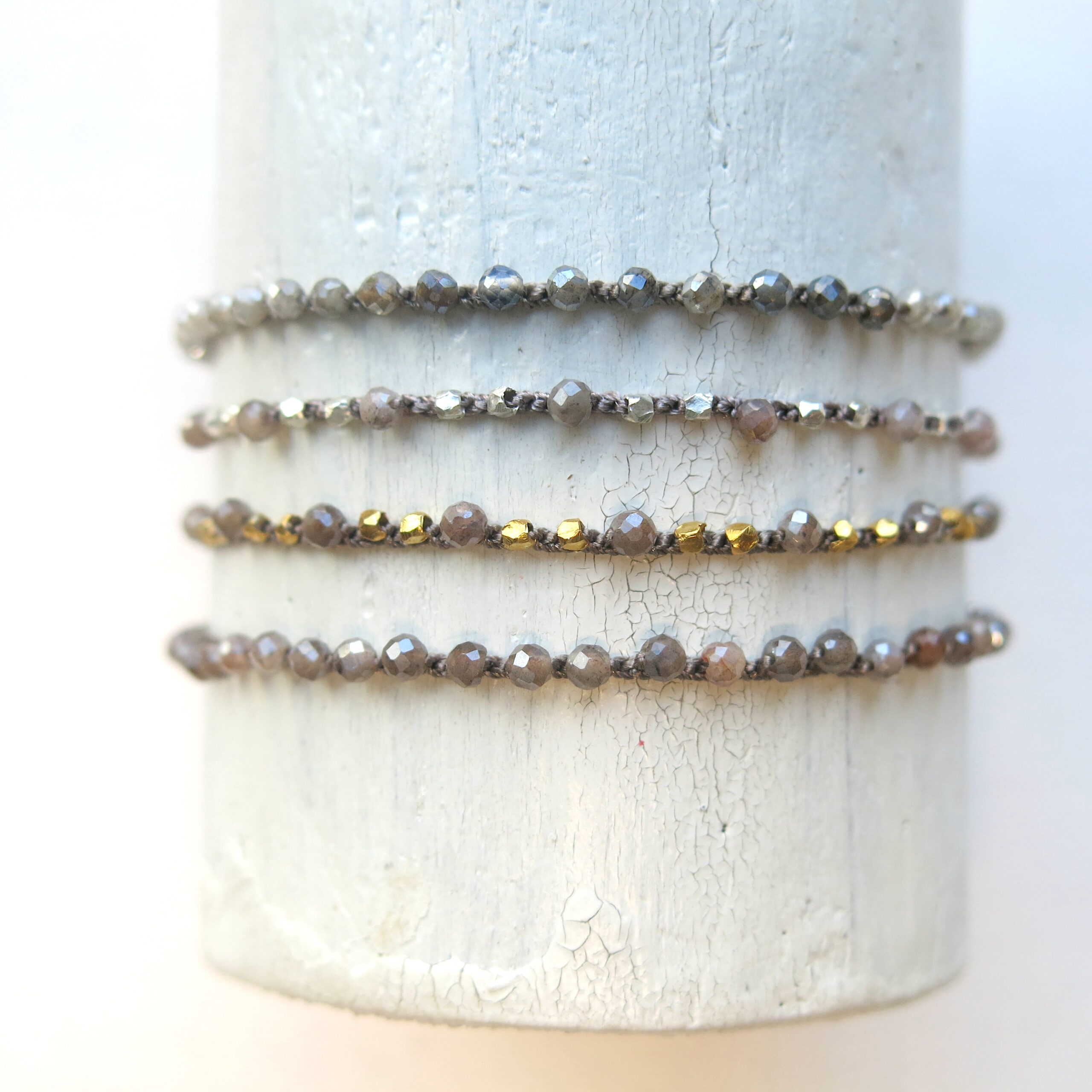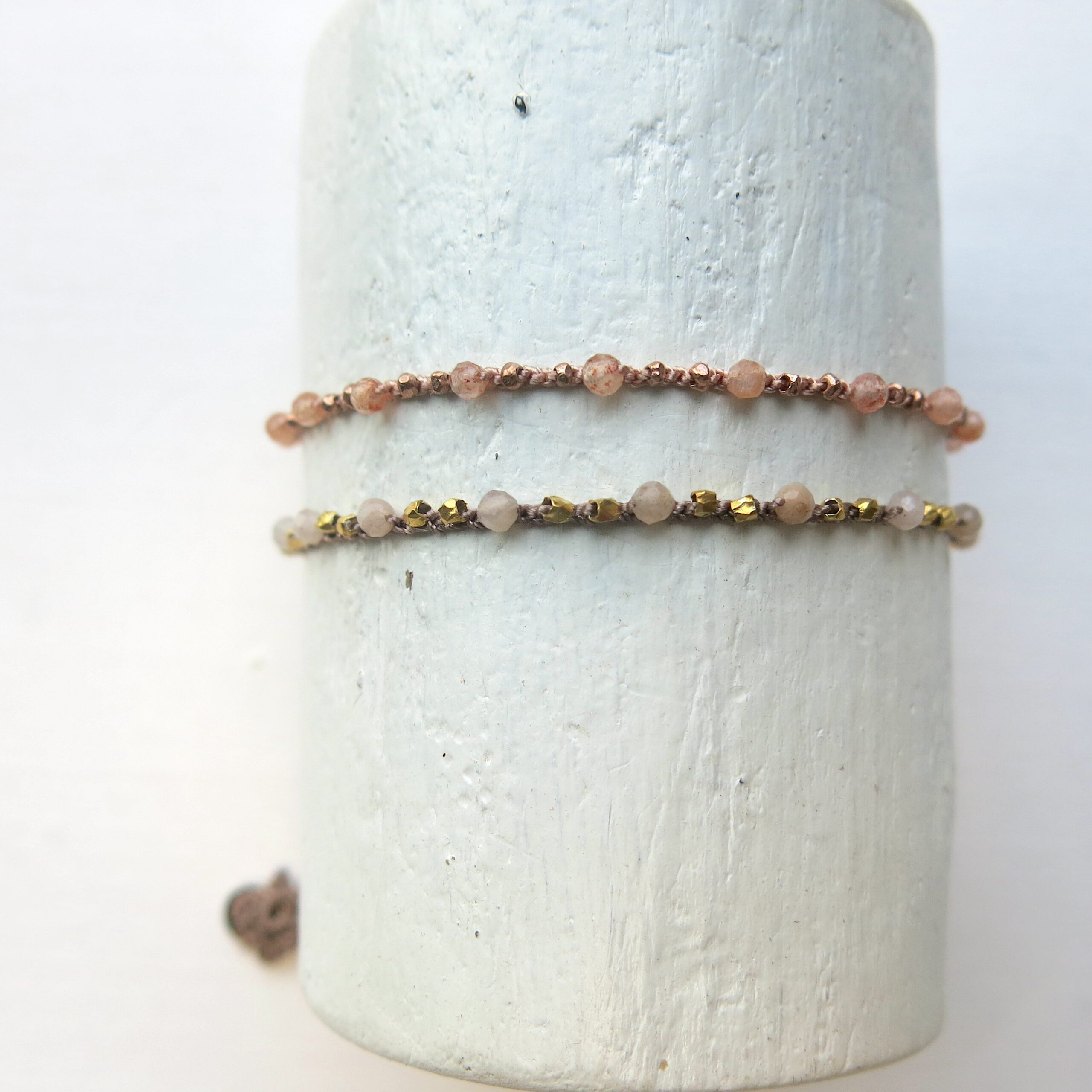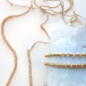 Die Armbänder haben als Art Verschluss eine verschiebbare Perle, die sich auf Ihre individuelle Größe regulieren lässt.