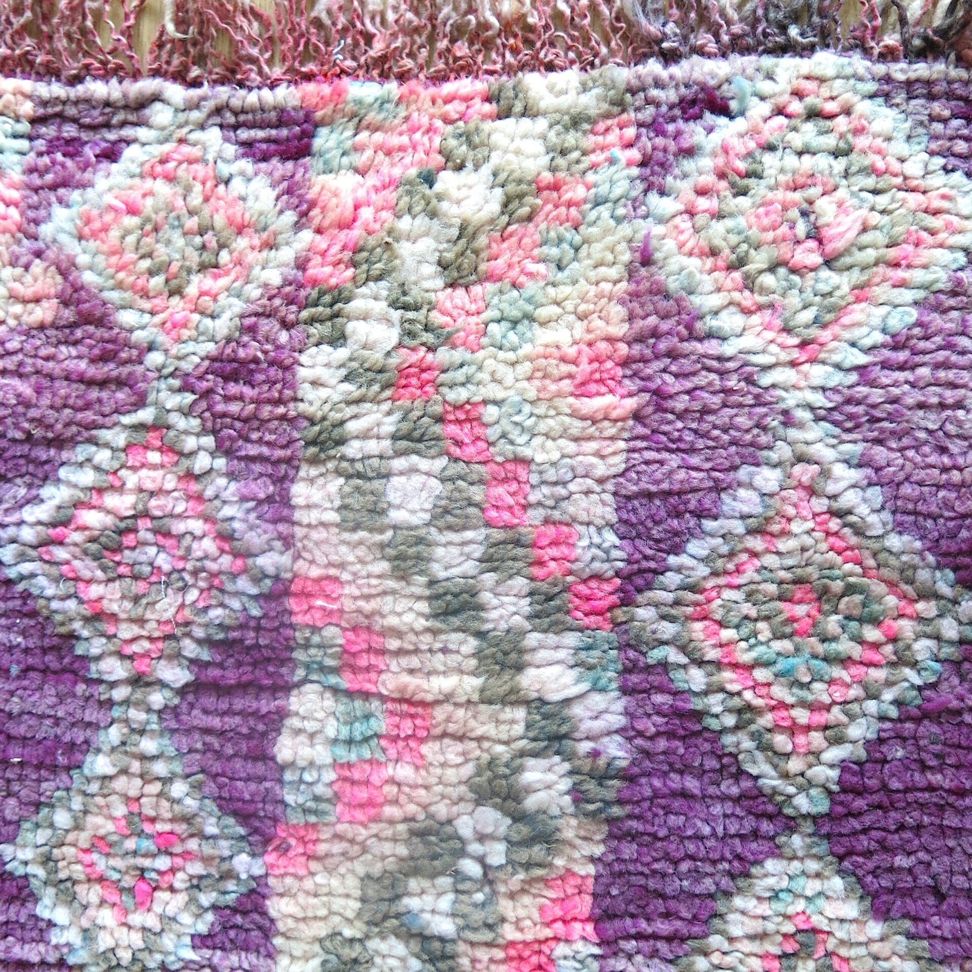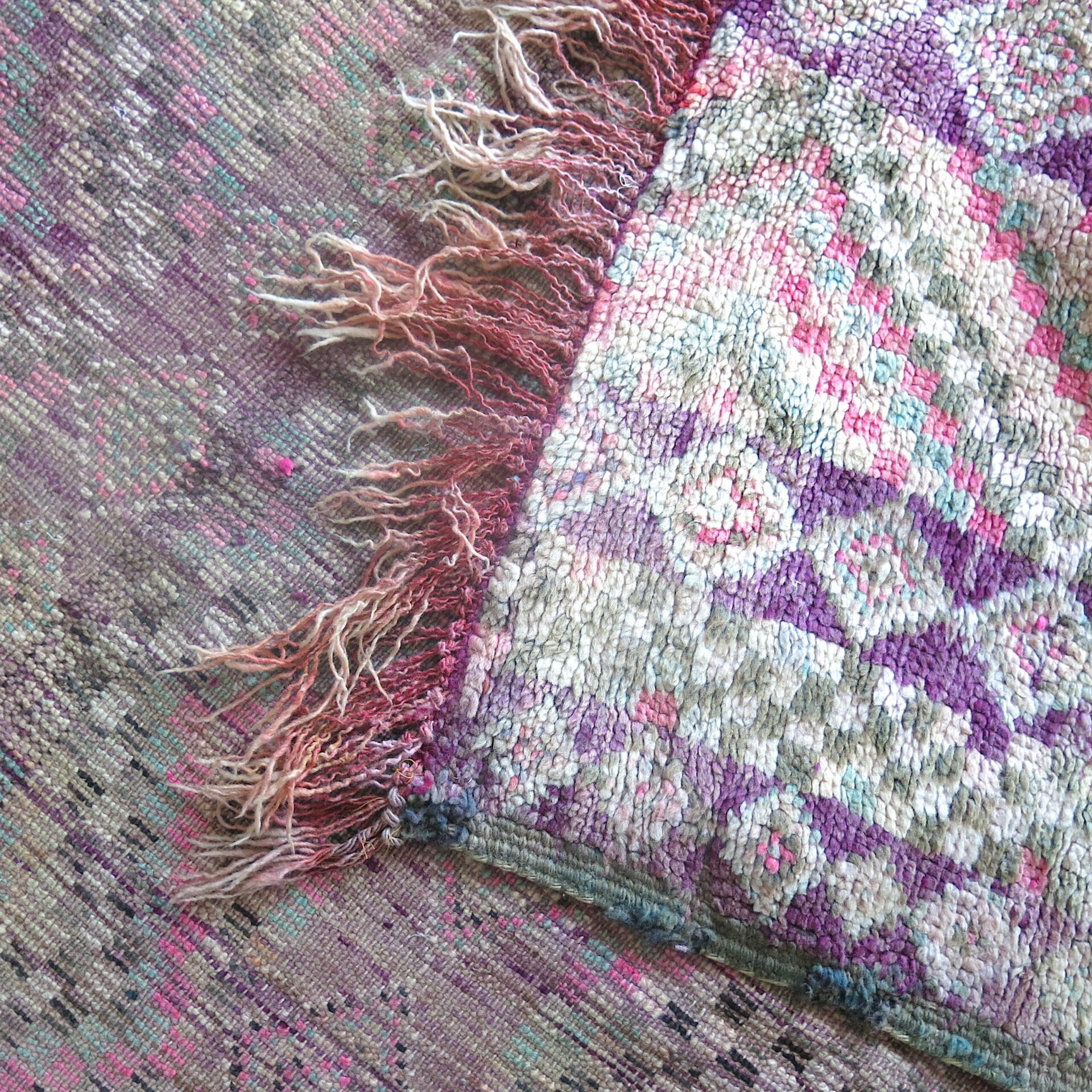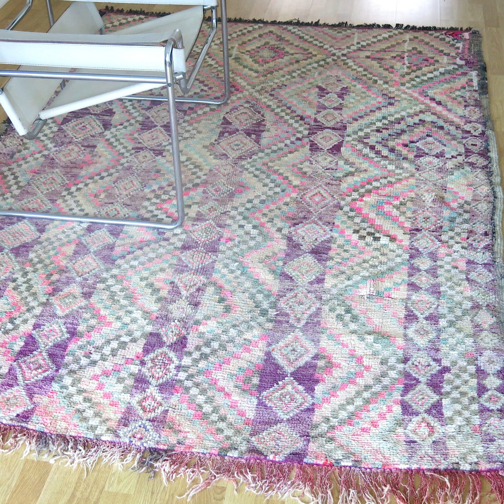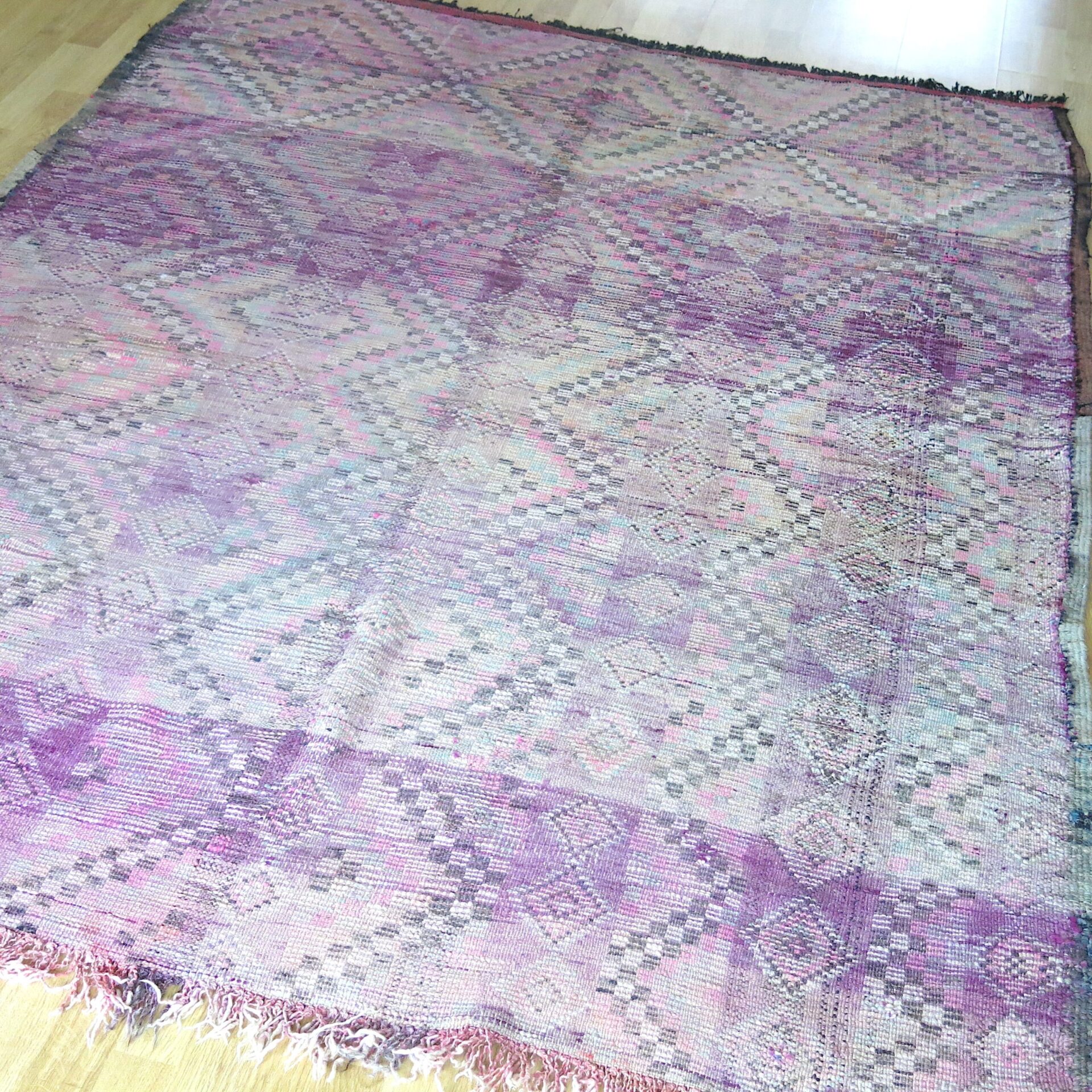 Bei einem Berber Teppichhändler im ’souk tapis‘ in Marrakech entdeckt: diesen aussergewöhnlichen vintage Berber ‚Boujaad‘ Teppich in toller Farbigkeit – verwaschene Lila – Rosa-Töne mit Pink und Grüntönen als Farbakzente.
