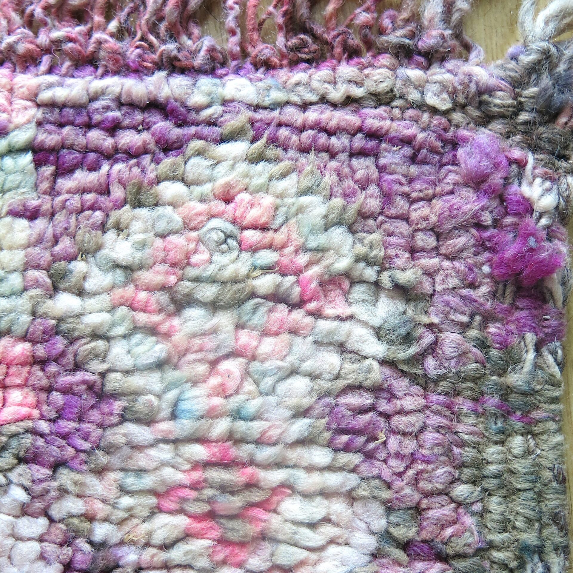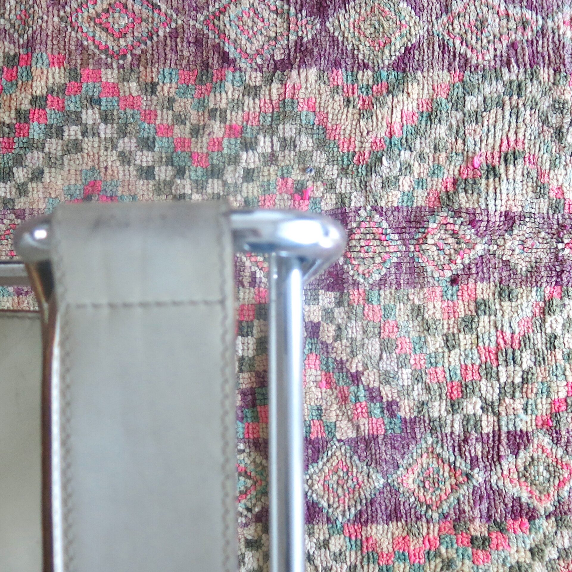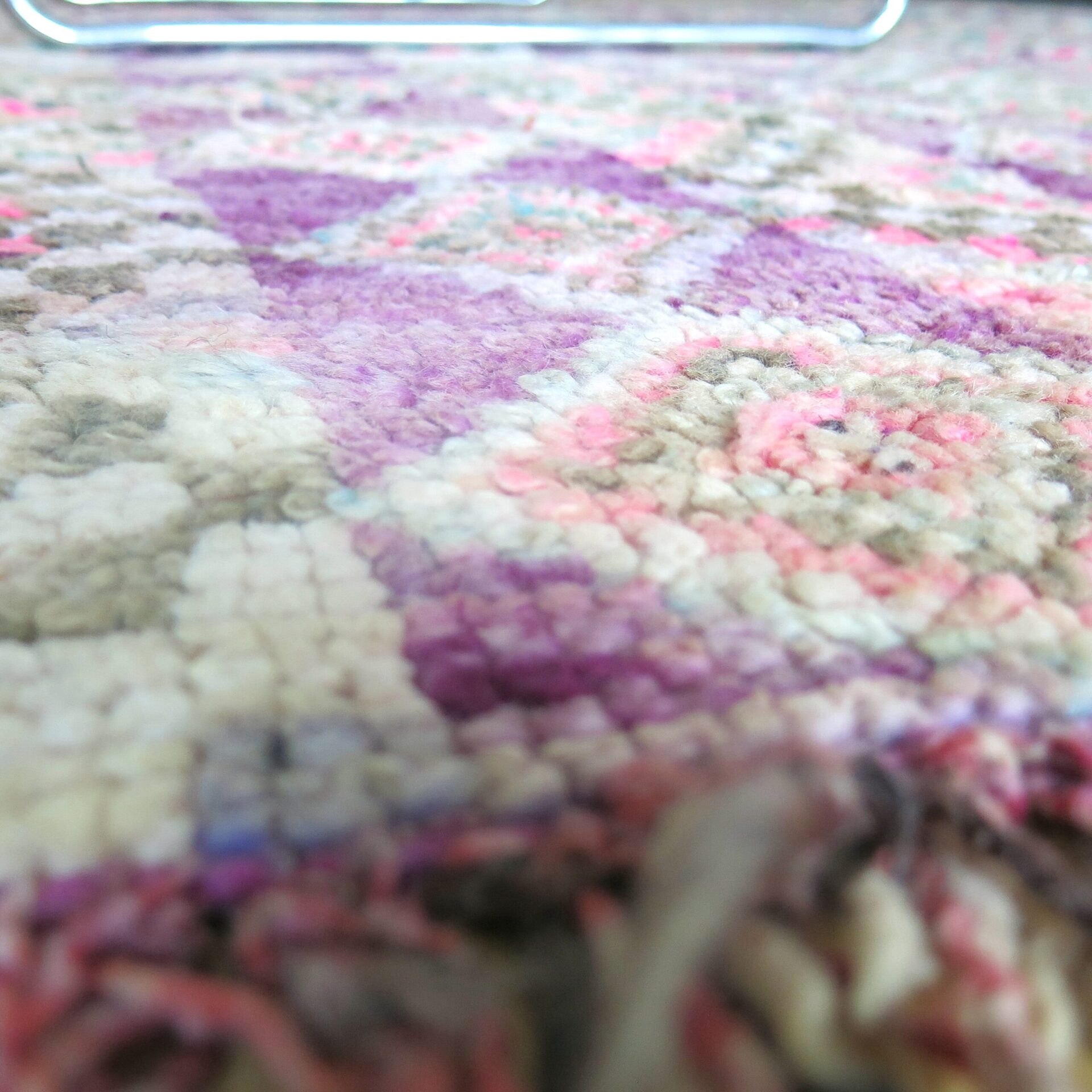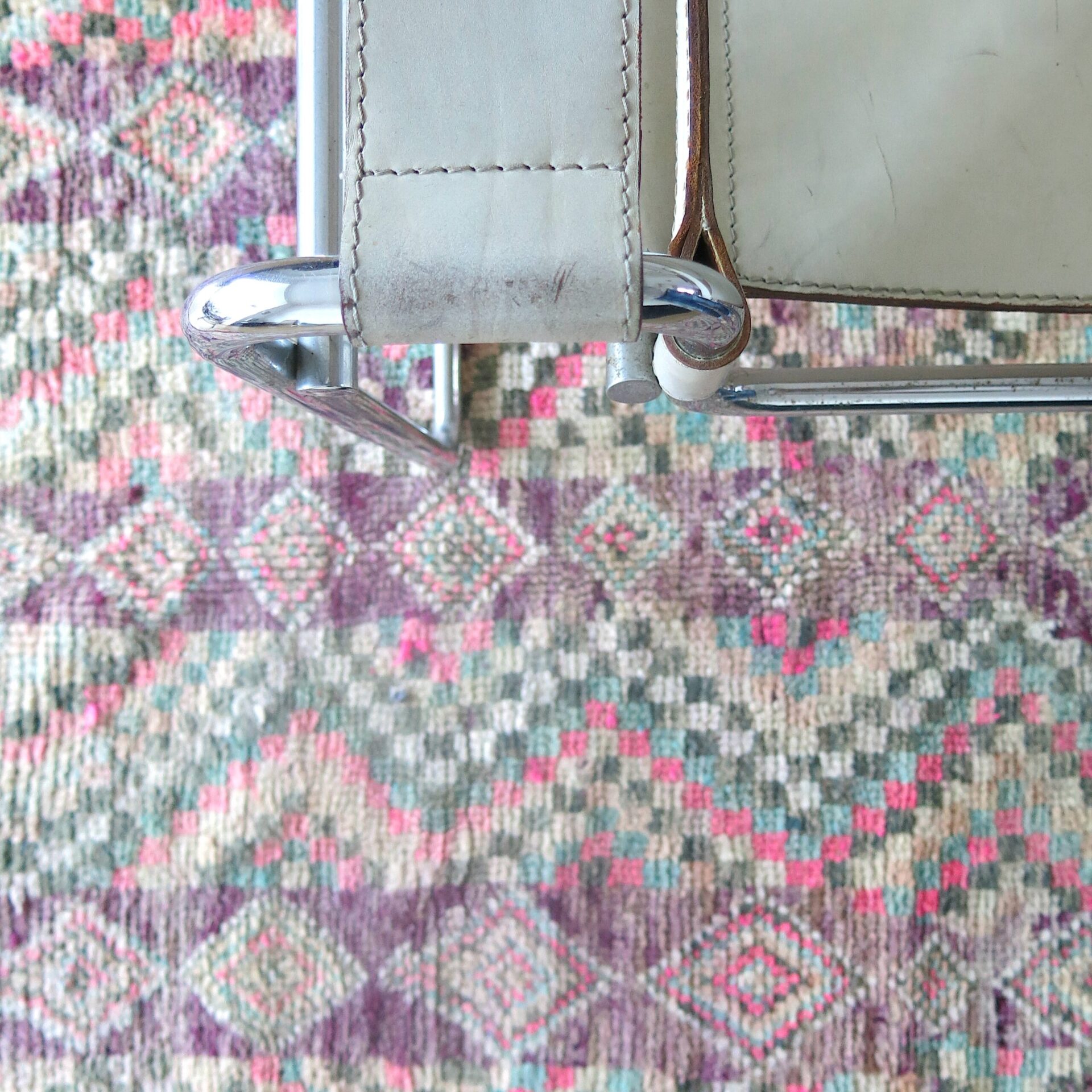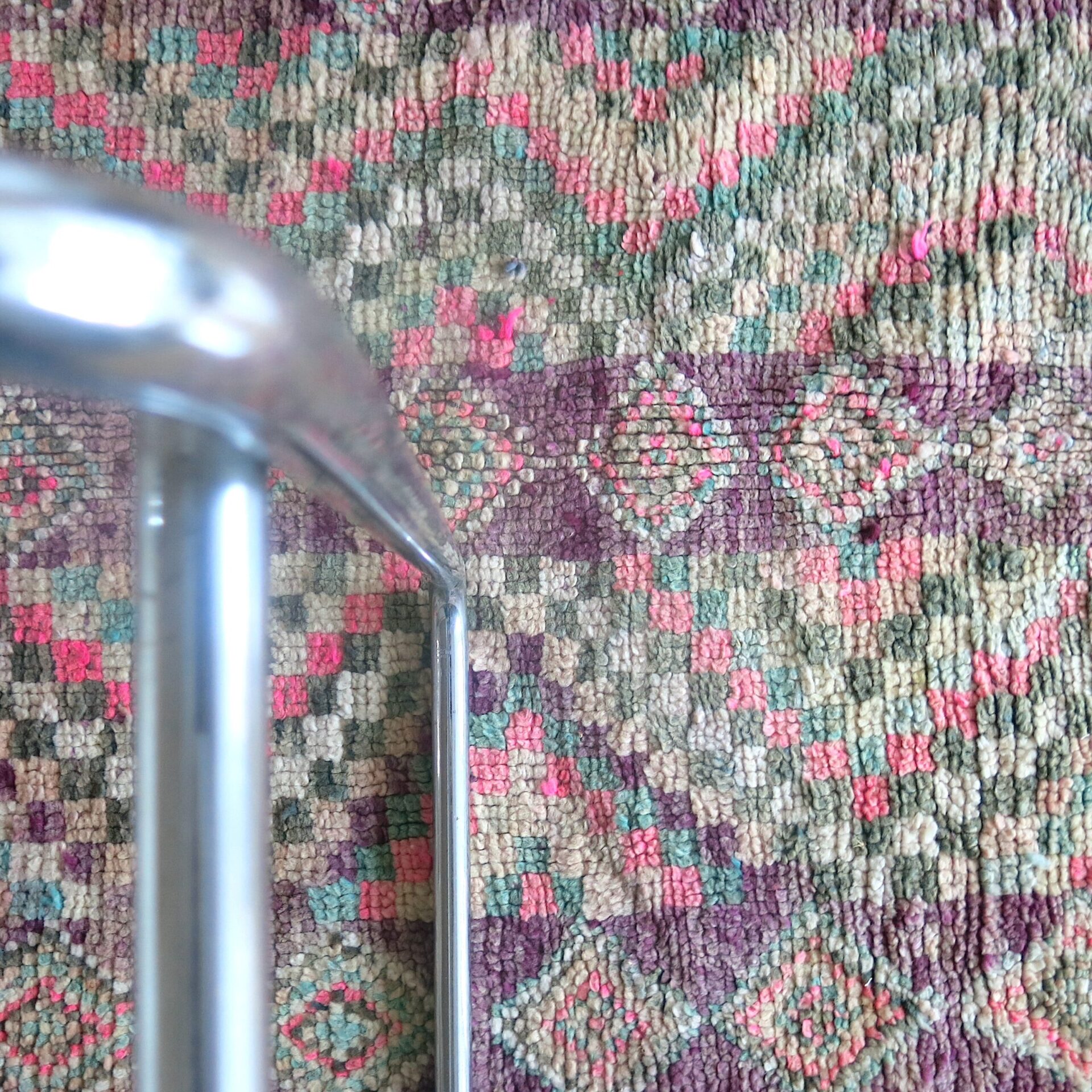 Bei einem Berber Teppichhändler im ’souk tapis‘ in Marrakech entdeckt: diesen aussergewöhnlichen vintage Berber ‚Boujaad‘ Teppich in toller Farbigkeit – verwaschene Lila – Rosa-Töne mit Pink und Grüntönen als Farbakzente.
