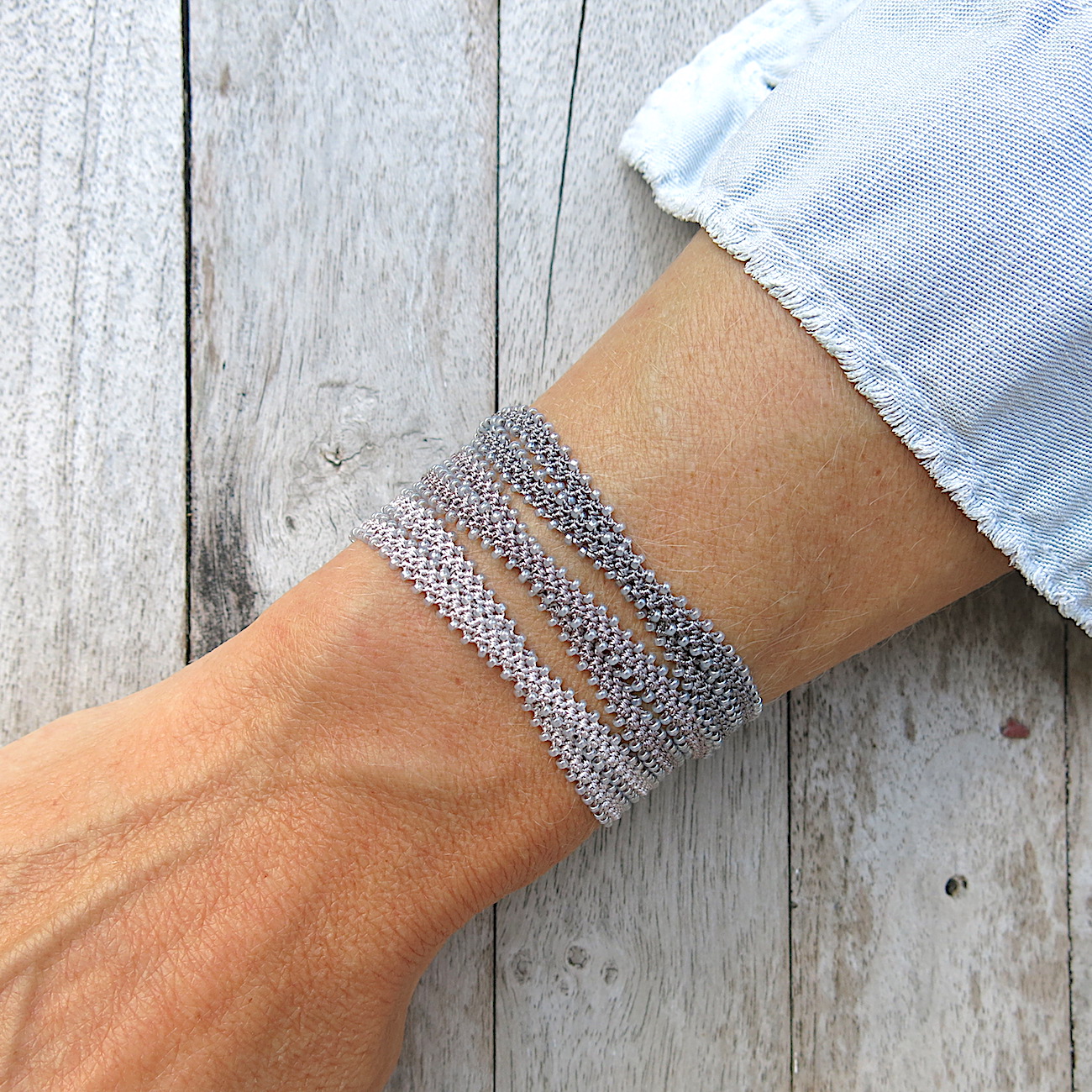 Diese drei Farb-Varianten von ‚Helene‘ entstehen durch ein Zusammenspiel von einer fein grau-silber schimmernden MIYUKI Rocailles Perle mit einem 1,6mm Durchmesser und eher dezenten Garnfarben.