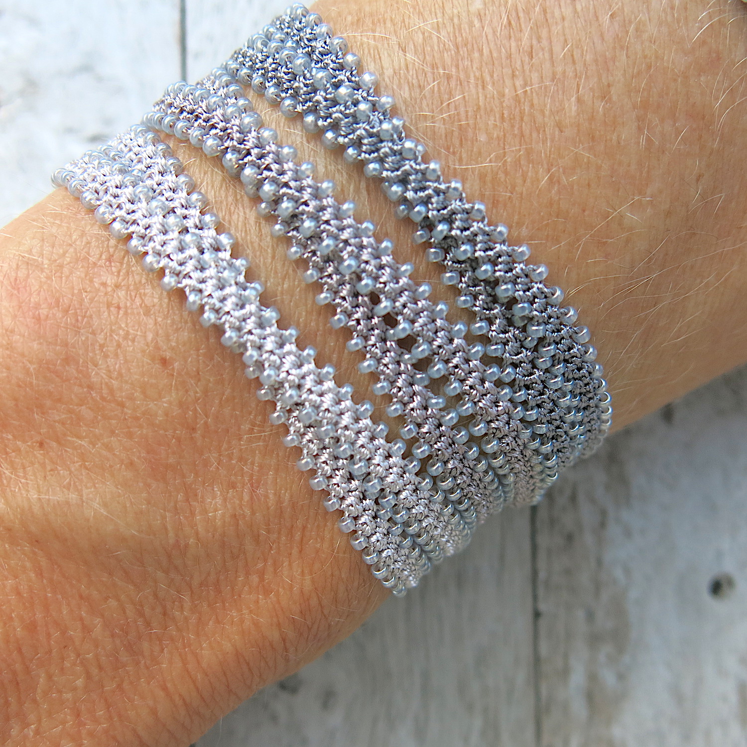 Doppeltes Häkel Armband mit grau-silber schimmernden Glasperlen