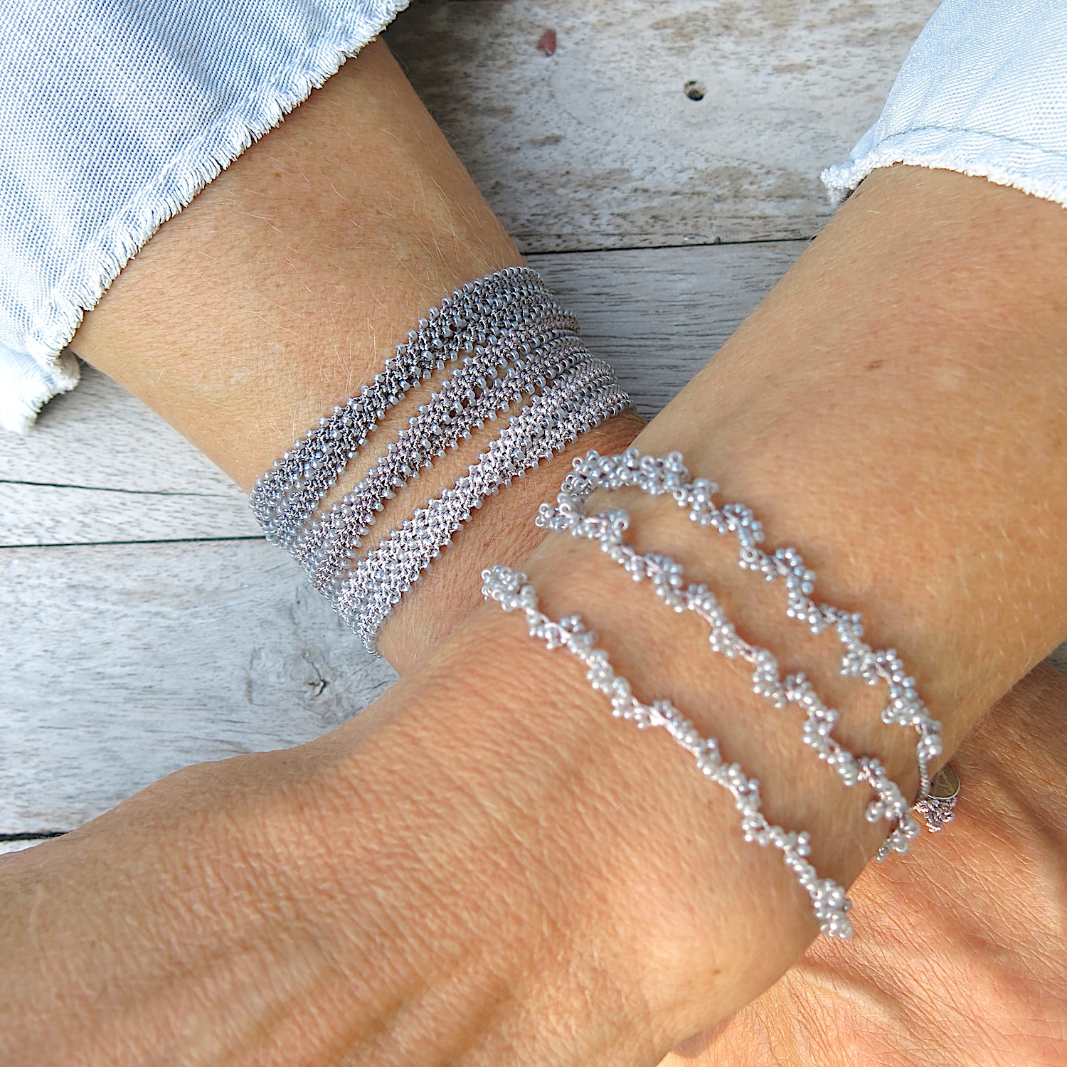 Die Accessoires wirken auf den ersten Blick eher ’schlicht‘ – beim näheren Hinschauen erkennt man die filigrane und aufwendige Handarbeit. Trotzdem soll ‚der Look‘ eher schlicht und dezent sein. Ein Accessoire, welches man täglich tragen kann und was sich leicht kombinieren lässt. Die Armbänder aus der Kollektion lassen sich untereinander wundervoll zusammen stellen, aber auch in Kombination mit anderem Schmuck harmonisieren sie sehr schön.