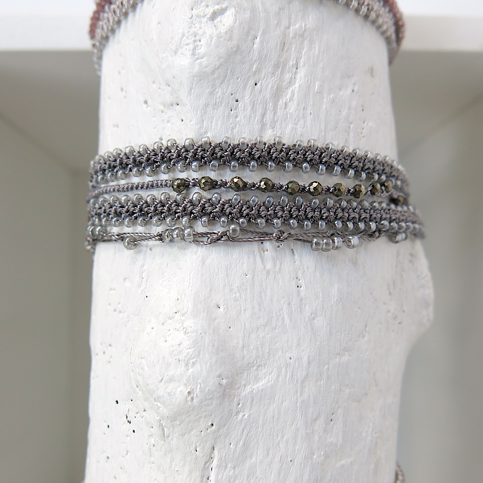 Unser doppeltes Häkel Armband mit grau-silber schimmernden Glasperlen
