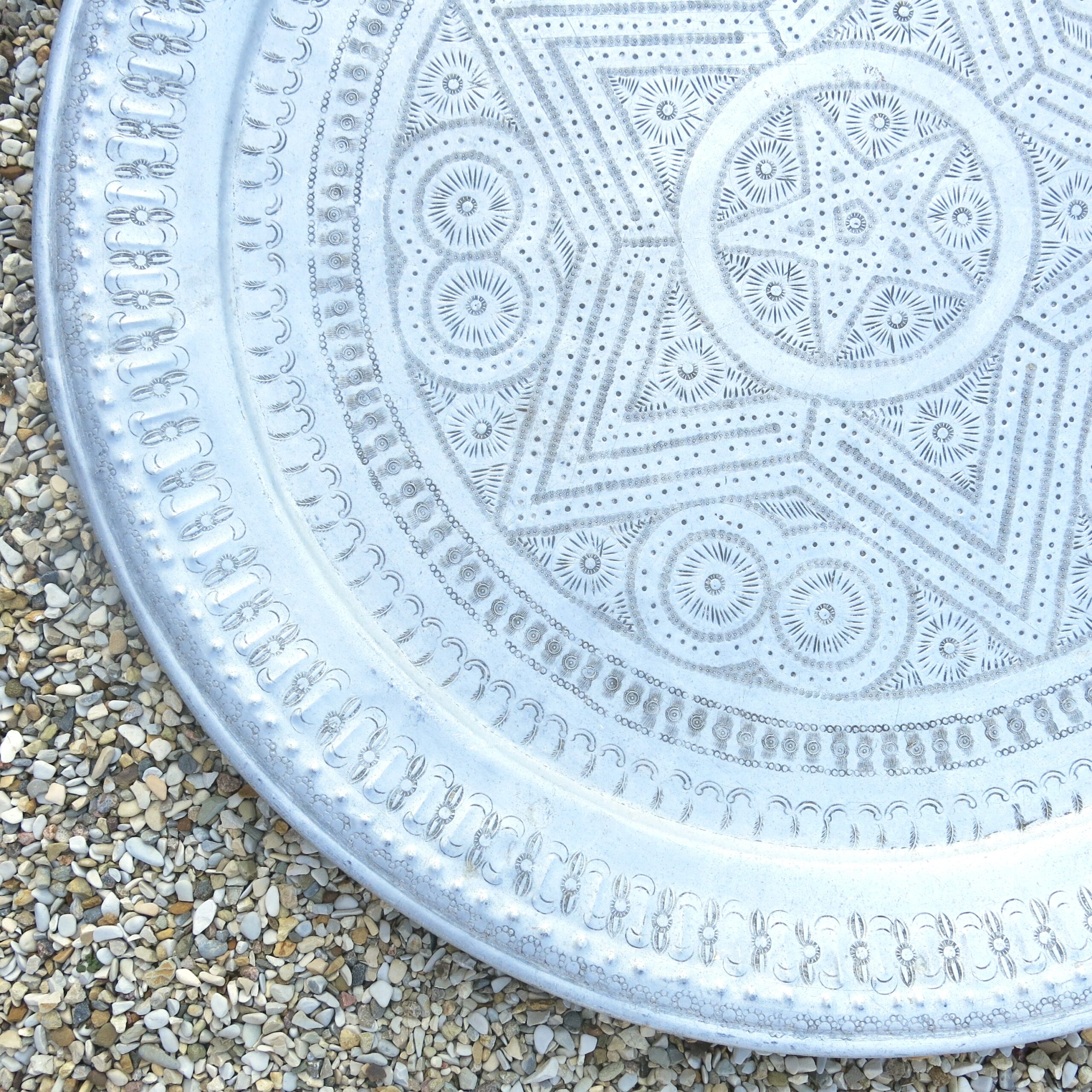 Immer bin ich vor Ort auf der Suche nach diesen alten gebrauchten Teetabletts – in einem ‚foundouk‘ in der Medina in Marrakech finde ich immer wieder wunderschöne Stücke: die noch handgefertigten, handgehämmerten Tabletts werden in Marokko als Teetische, Tische verwendet. Man sieht sie immer mit den typischen verzierten Holz-Gestellen als Untergestell. Ich biete dazu Eisen-Klappgestelle an. So können Sie die Teetische auch wunderbar im Aussenbereich für Garten oder Terrasse nutzen. Jedes Tablett ist ein Unikat. Sie werden per Handarbeit mit verschiedenen wunderschönen Gravuren, Ornamenten ziseliert.