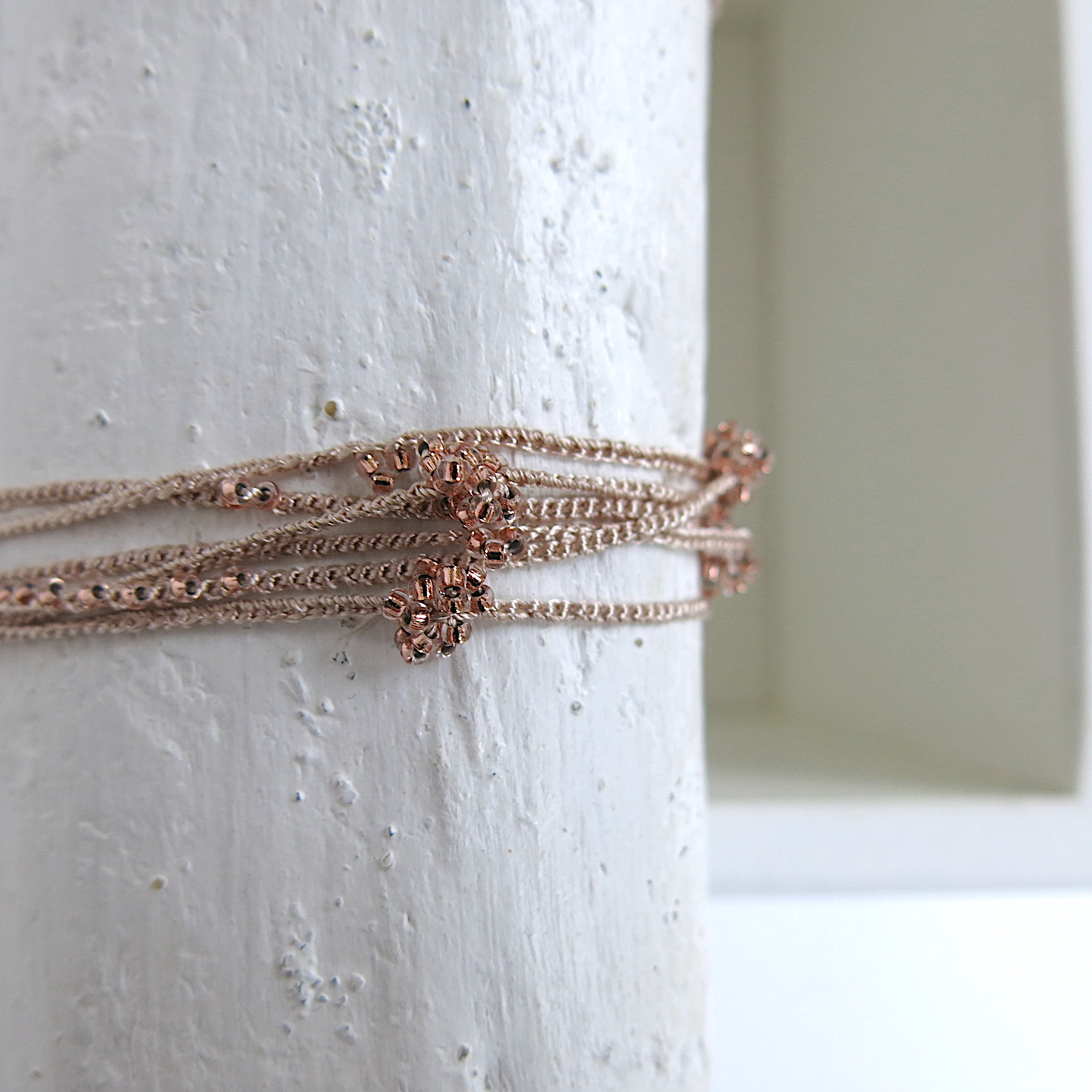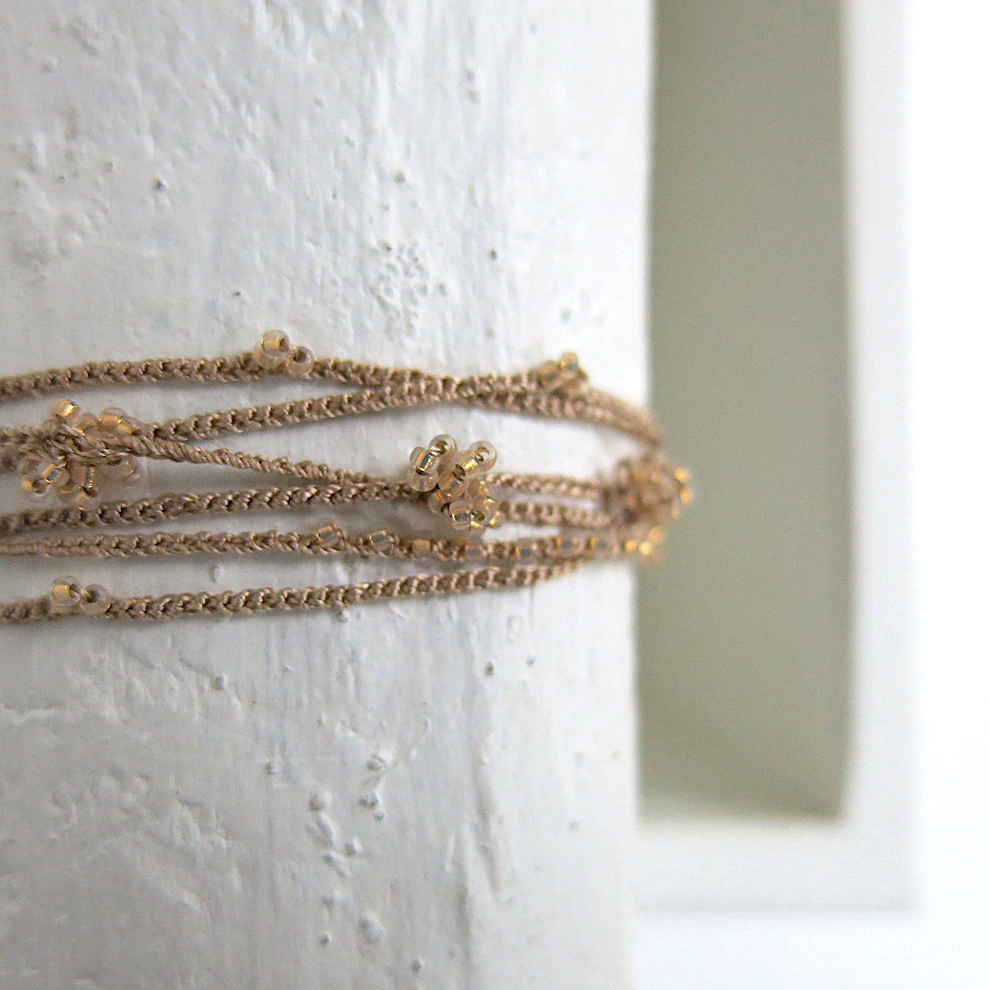 In den besonders feinen 1,6mm Rocailles Glasperlen ist die gehäkelte Kette ‚Bea‘ besonders schön als Armband – mehrfach um das Handgelenk gewickelt und mit leichtem Knoten fixiert. Man kann sie aber auch als lange – oder halsnahe Kette doppelt tragen. Mit einem einfachen lockeren Knoten bzw. ‚durchschlingen‘ ist die Kette gut fixiert, da sie sich an den Art ‚Beeren‘ (Perlen-Verdickungen) quasi ‚verhakt‘. Für einen ‚filigran, femininen look‘.