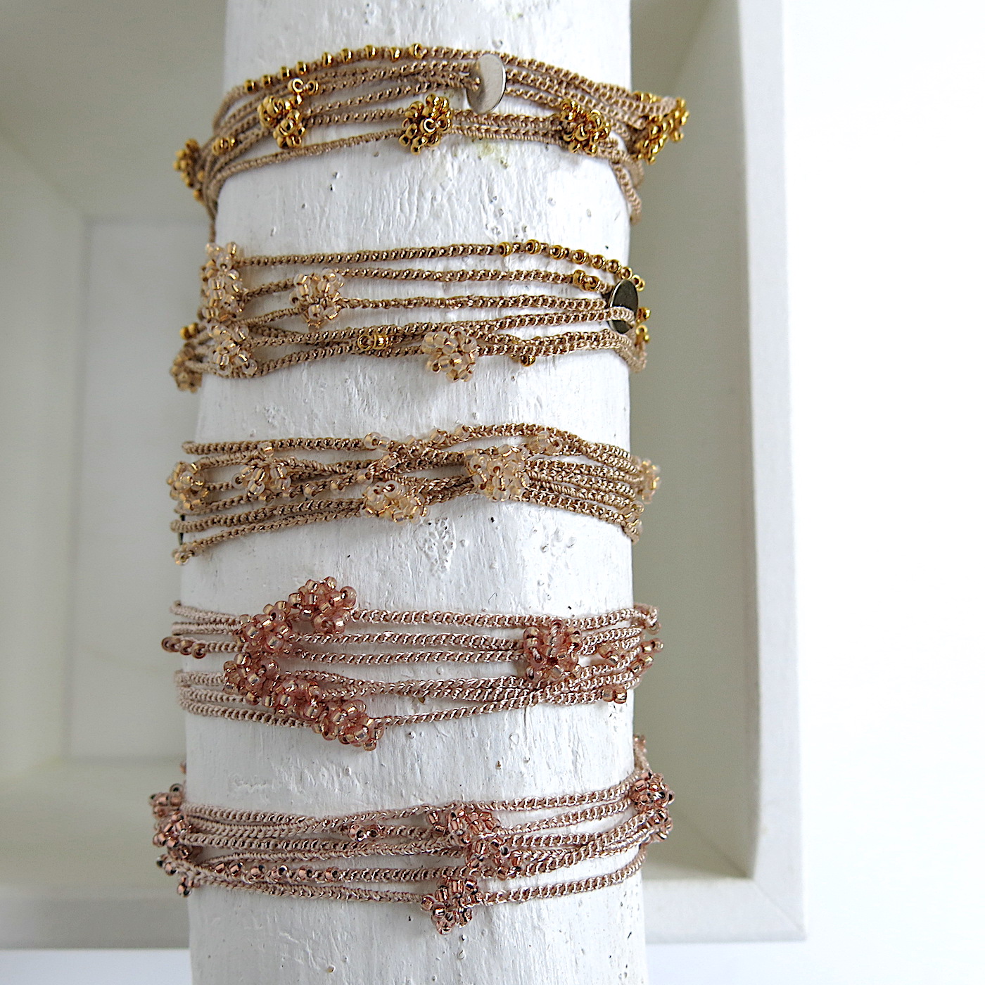 Unsere feine gehäkelte Kette und Wickelarmband aus Perlen in verschiedenen Edelmetallen