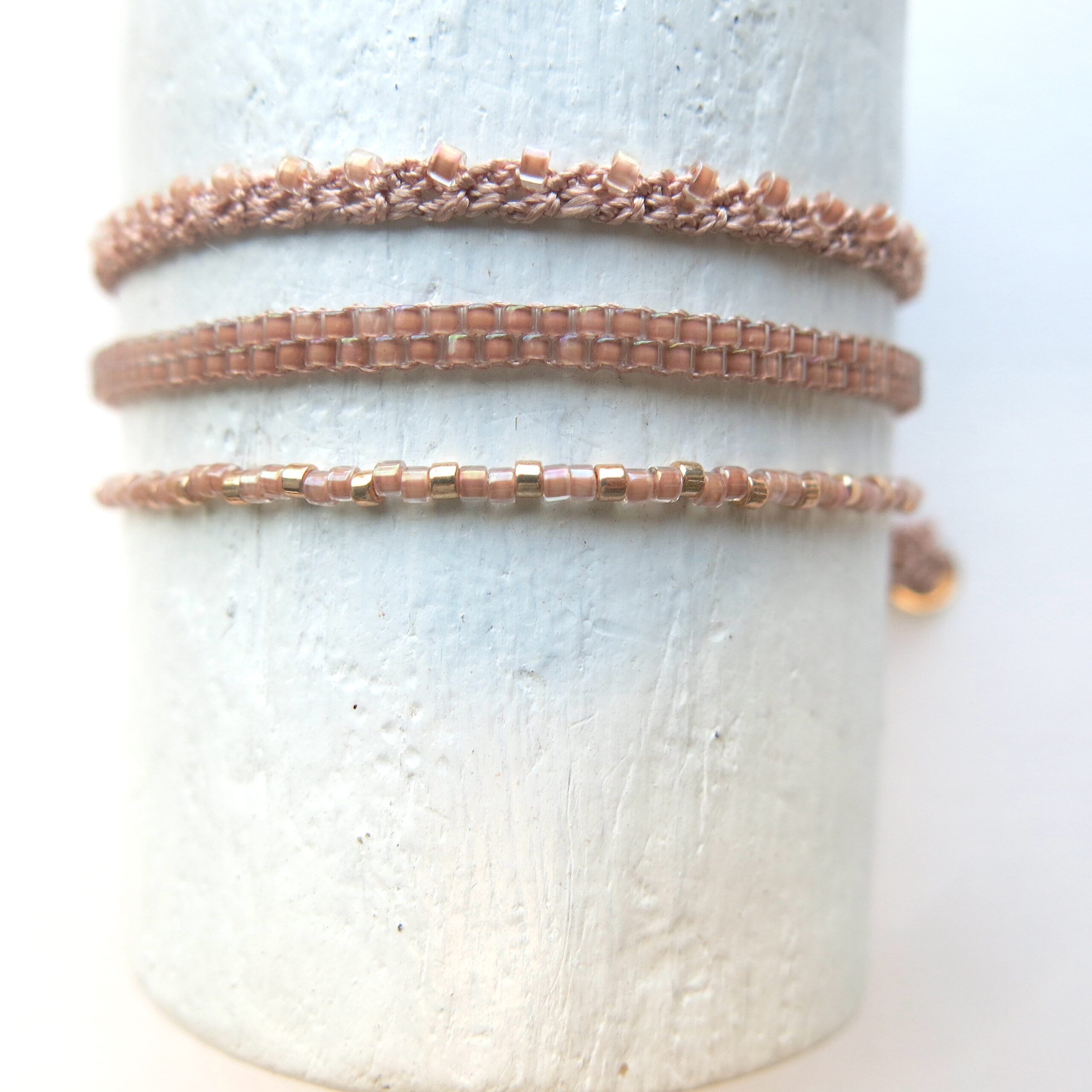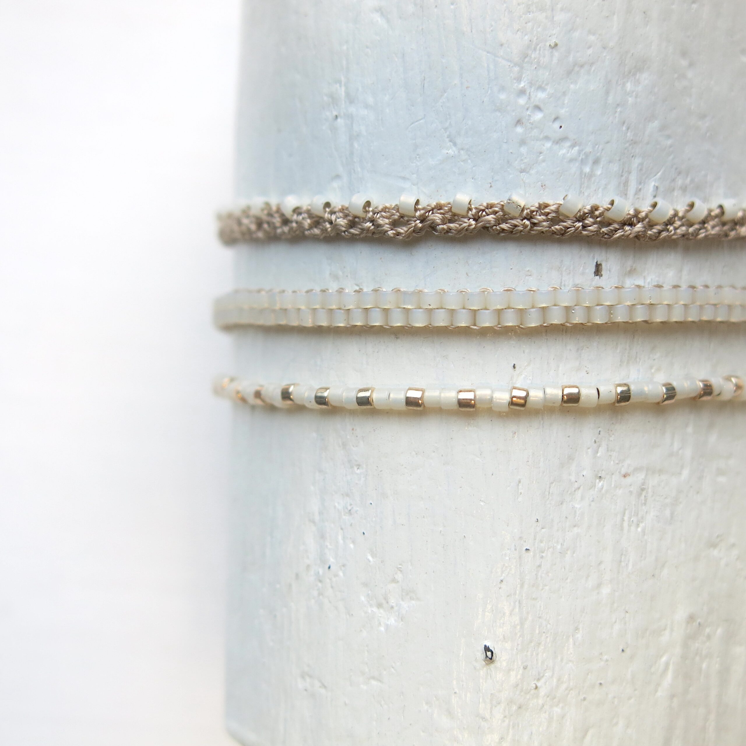 Die Armbänder haben als Art Verschluss eine verschiebbare Perle, die sich auf Ihre individuelle Größe regulieren lässt.