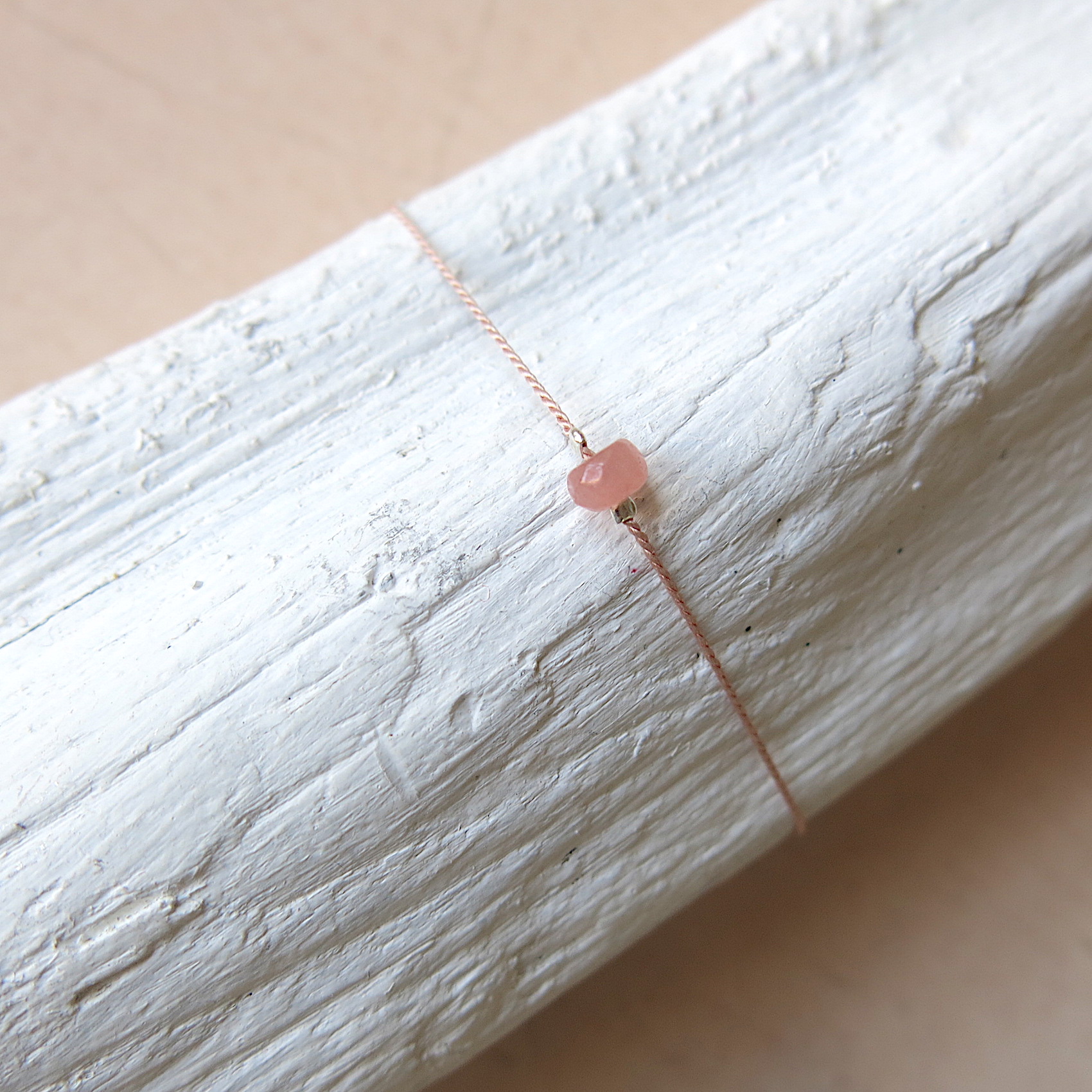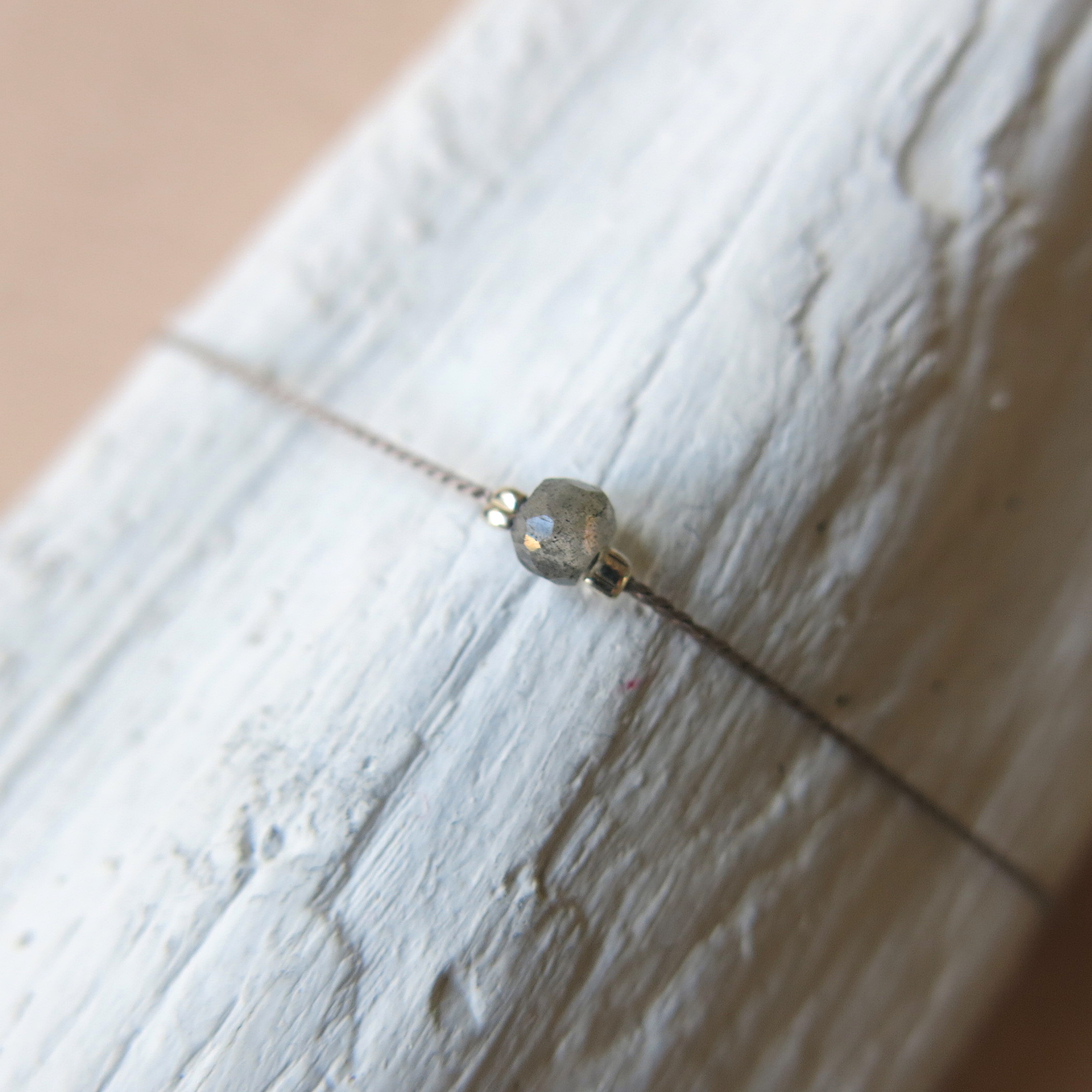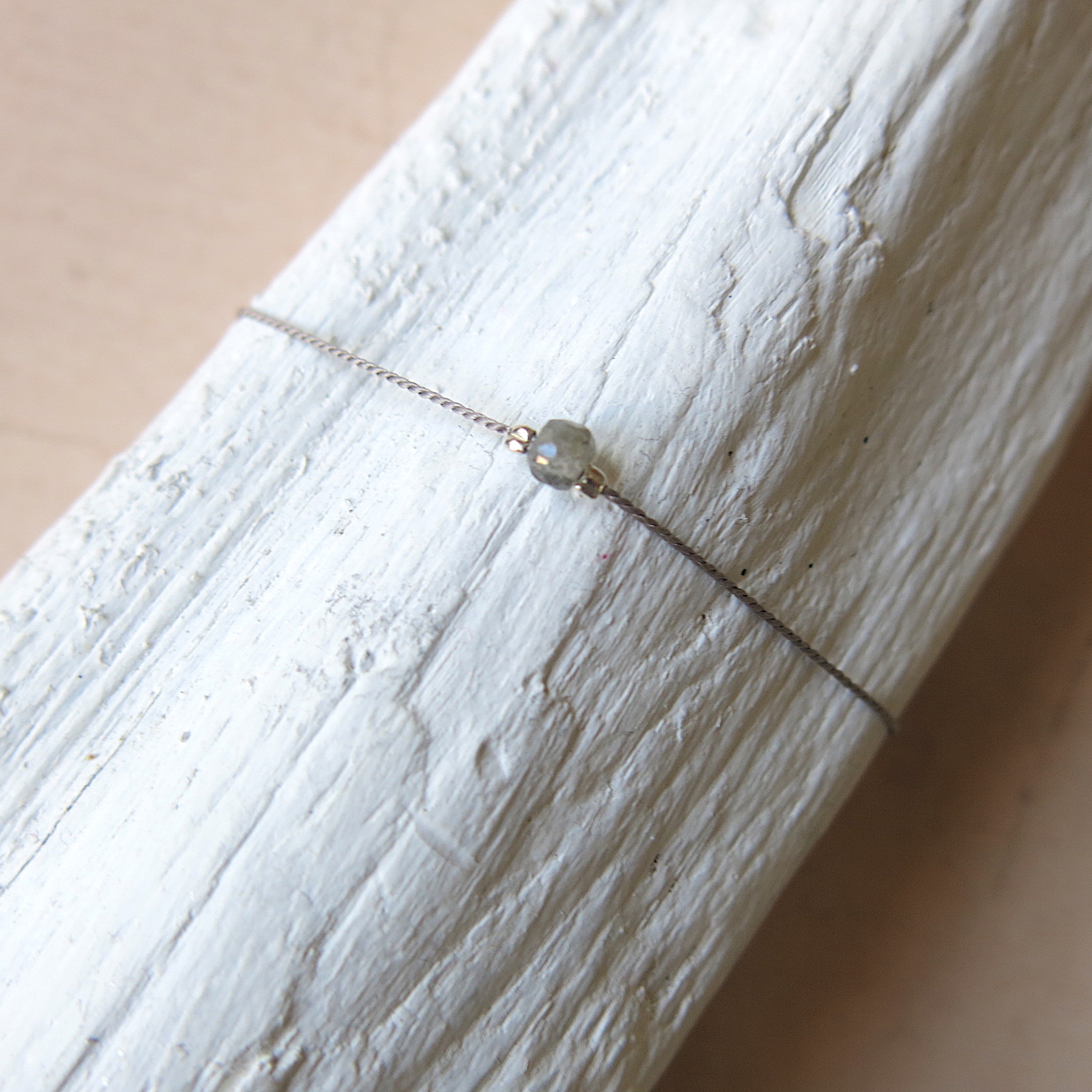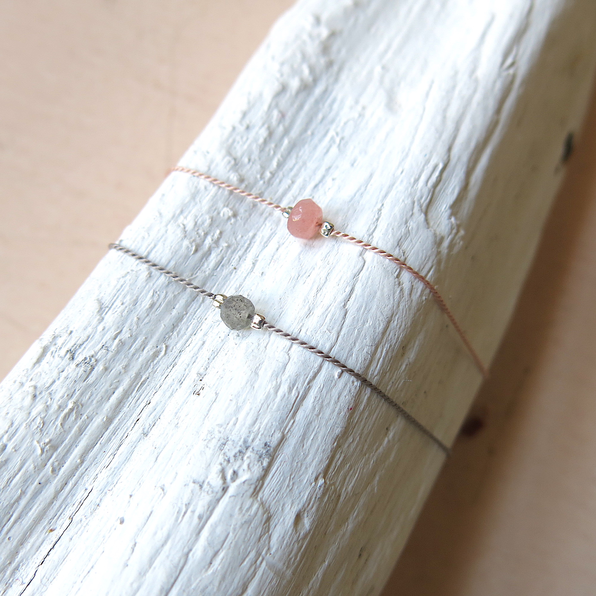 Dieses ist ein besonders feines Armbändchen mit einem mittig platzierten facettierten Edelstein – Cherry Rosenquarz und Labradorit. Der Stein wird beidseitig mit einer kleinen silbernen Quetschperle fixiert, was ein hübsches Silber-Detail ergibt.