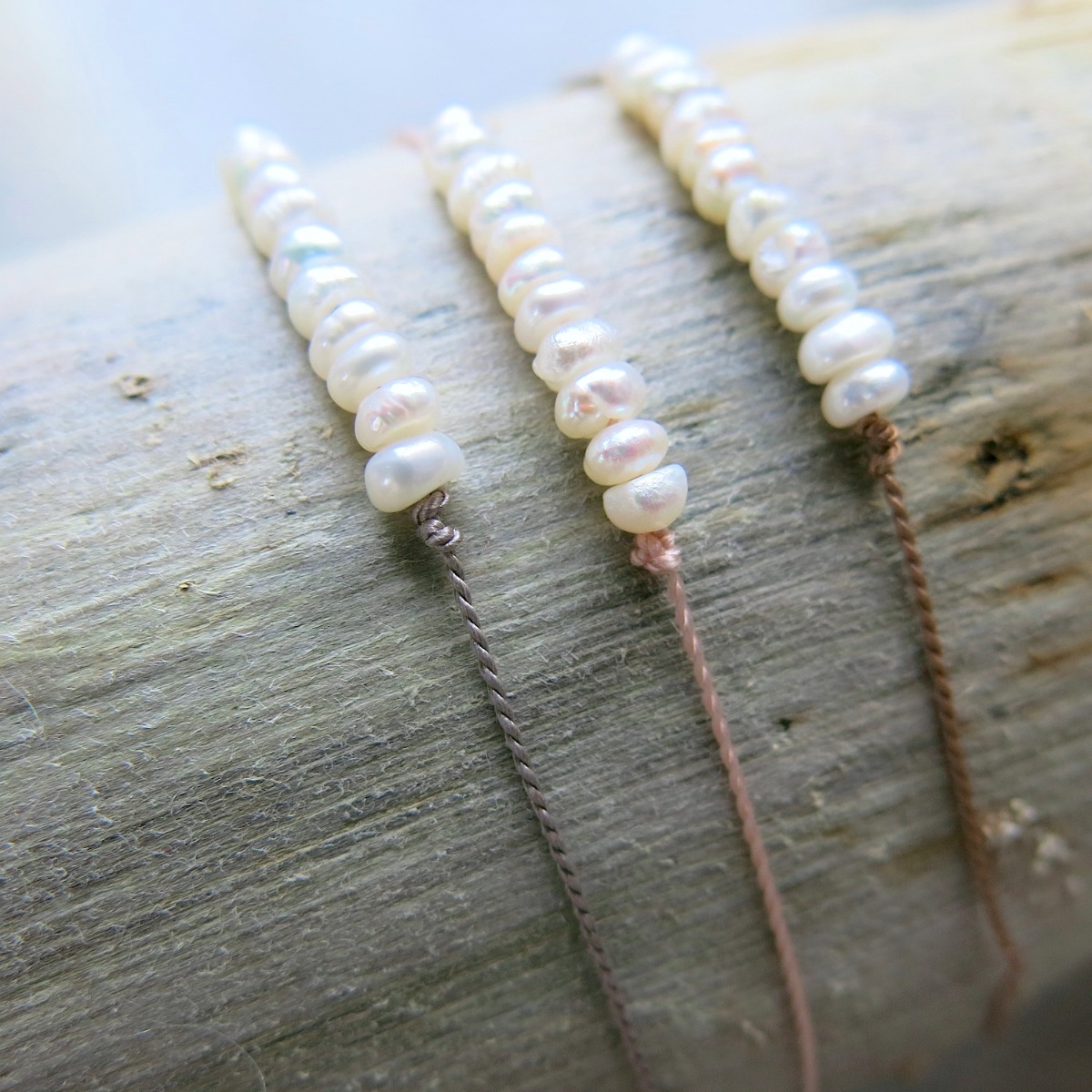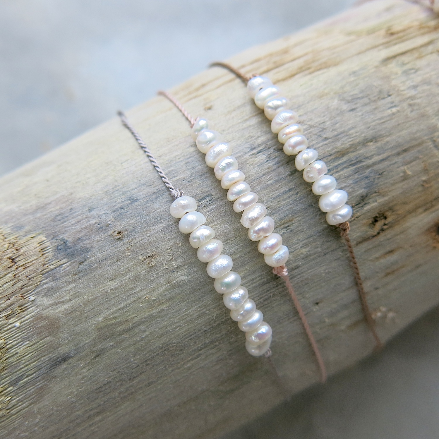 Dieses feminine Armbändchen mit elf kleinen, in Form naturbelassenen cremefarbenen Keshi Süsswasser-Perlchen gibt es in drei Farbvarianten – Zwirnfarbe beige, hellgrau oder hellrosa.