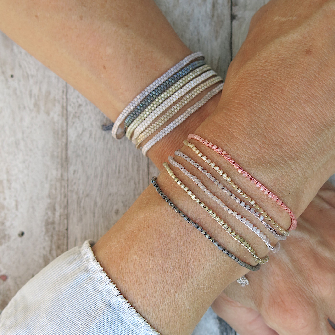 Die Armbänder sind so leicht, dass man Sie immer tragen kann. Selbst zum Duschen, Baden können Sie sie anlassen. Die hochwertigen MIYUKI Perlen und das feine Polyester Garn sind sehr beständig.