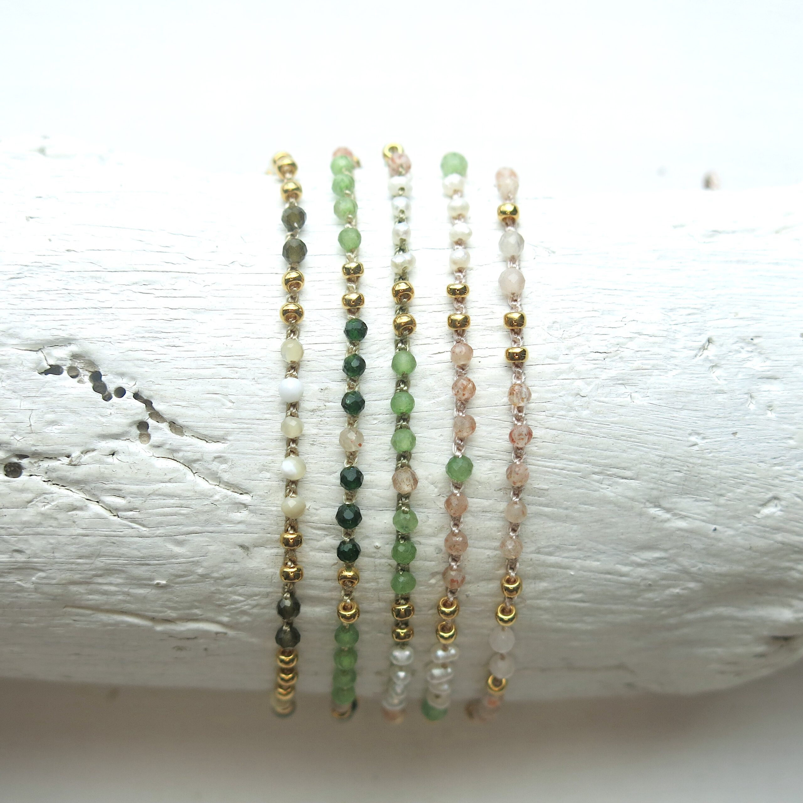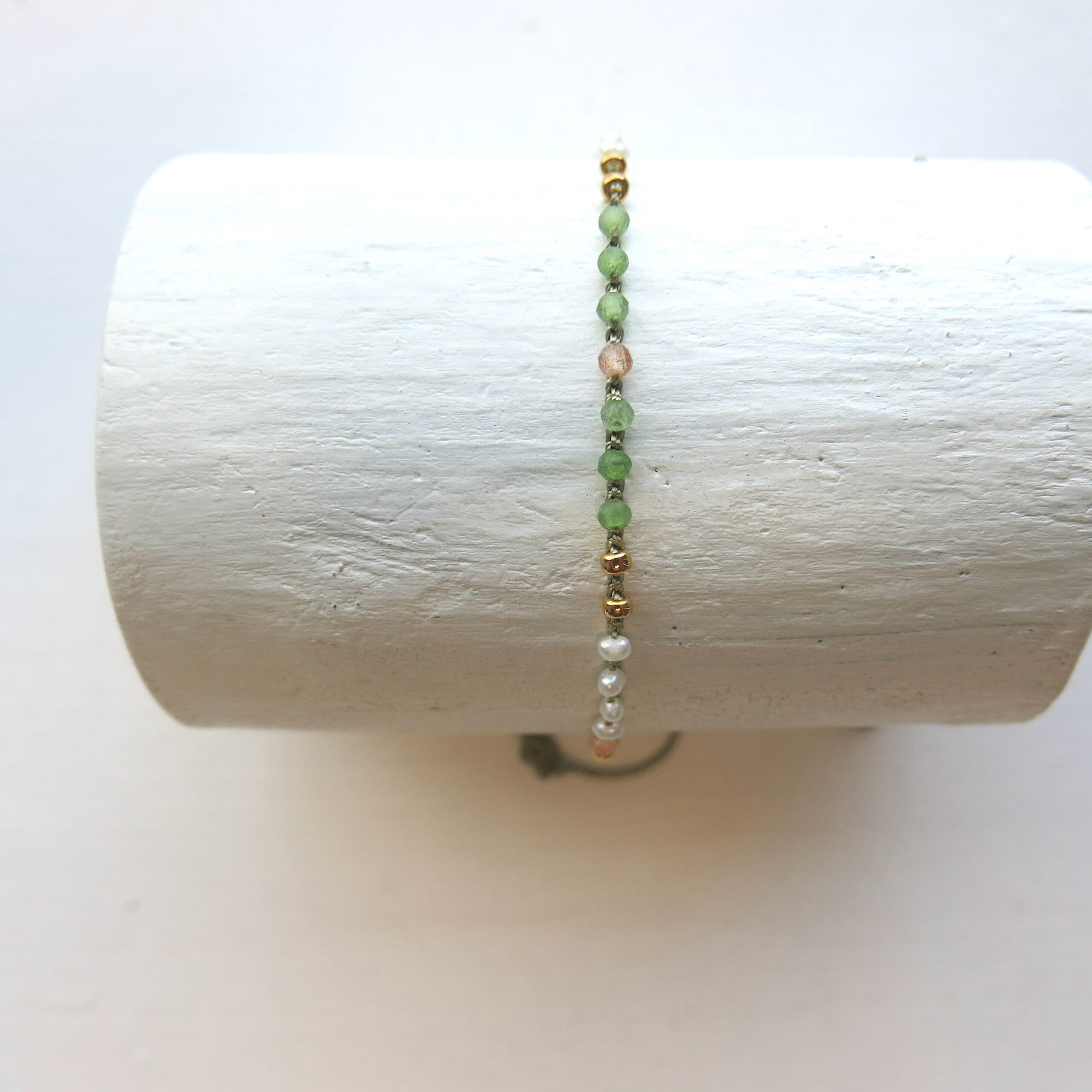 Modell ‚JETTE‘ ist ein feines gehäkeltes Armband im Edelstein Mix. Es gibt verschiedene Mix-Varianten diverser natürlicher Edelsteine in Kombination mit einer plated 2mm Miyuki Metallperle – gold, silber, rosesilber.