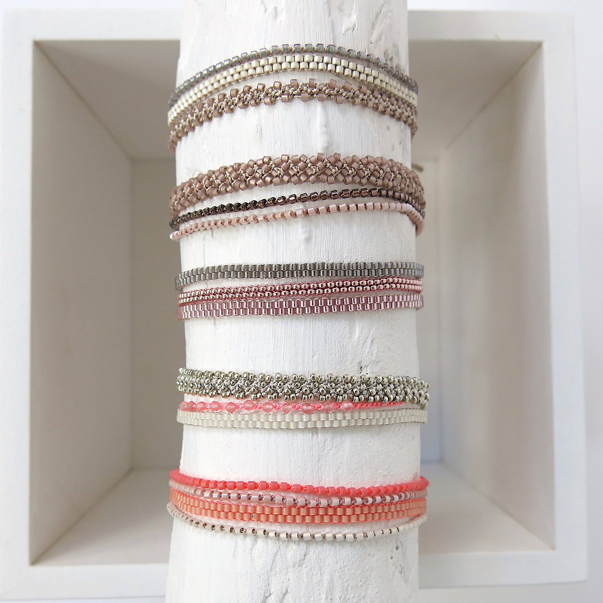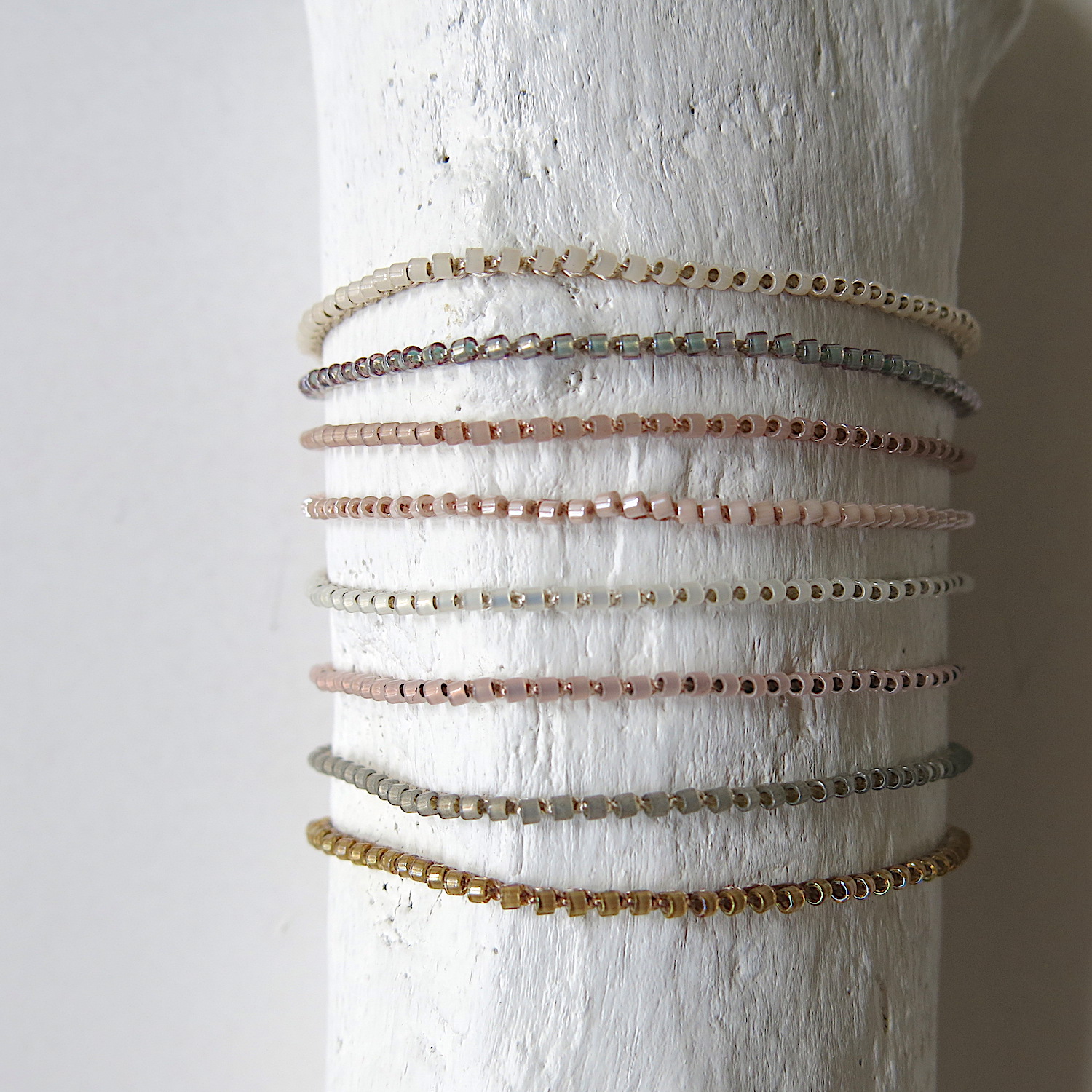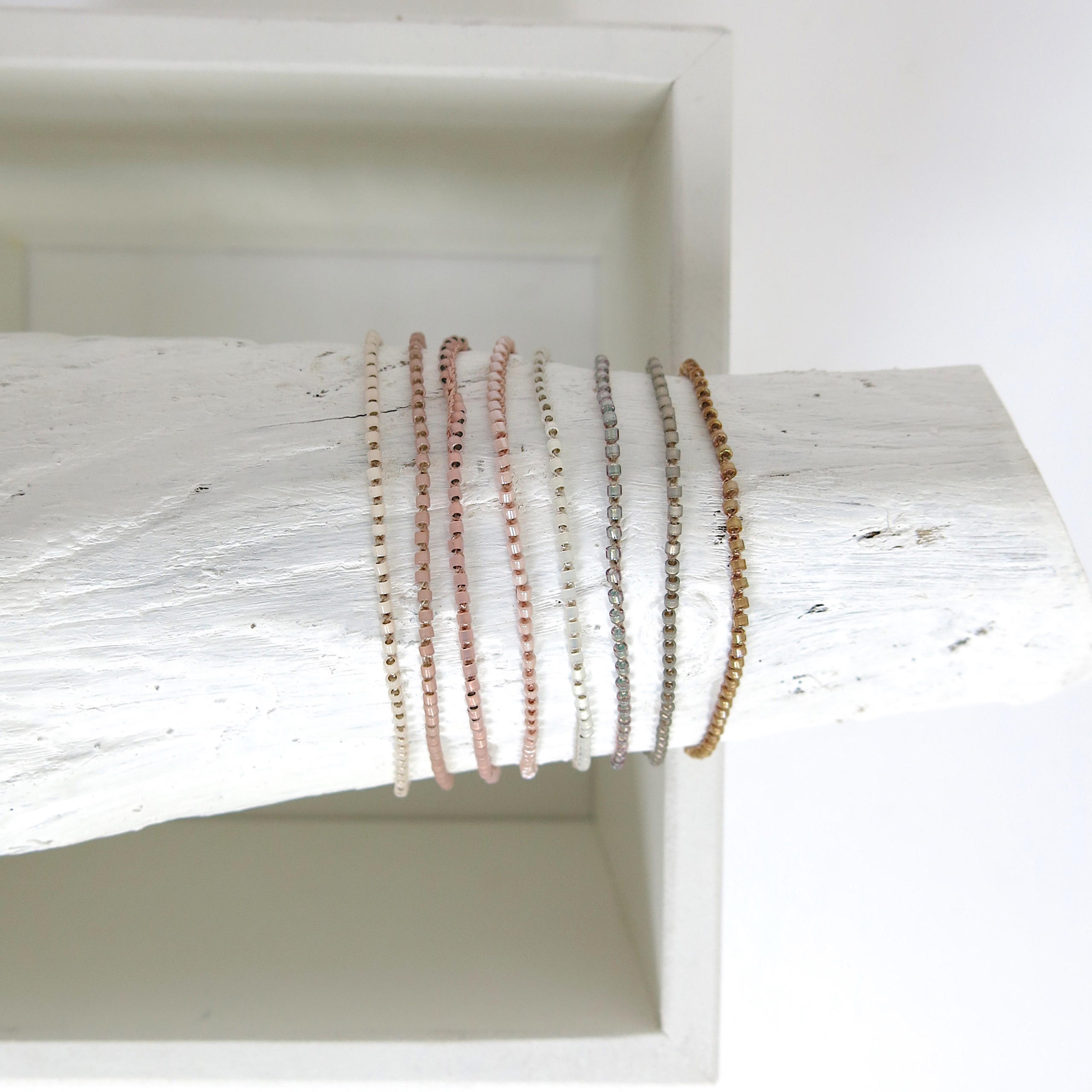 Die Armbänder sind so leicht, dass man Sie immer tragen kann. Selbst zum Duschen, Baden können Sie sie anlassen. Die hochwertigen MIYUKI Perlen und das feine Polyester Garn sind sehr beständig.