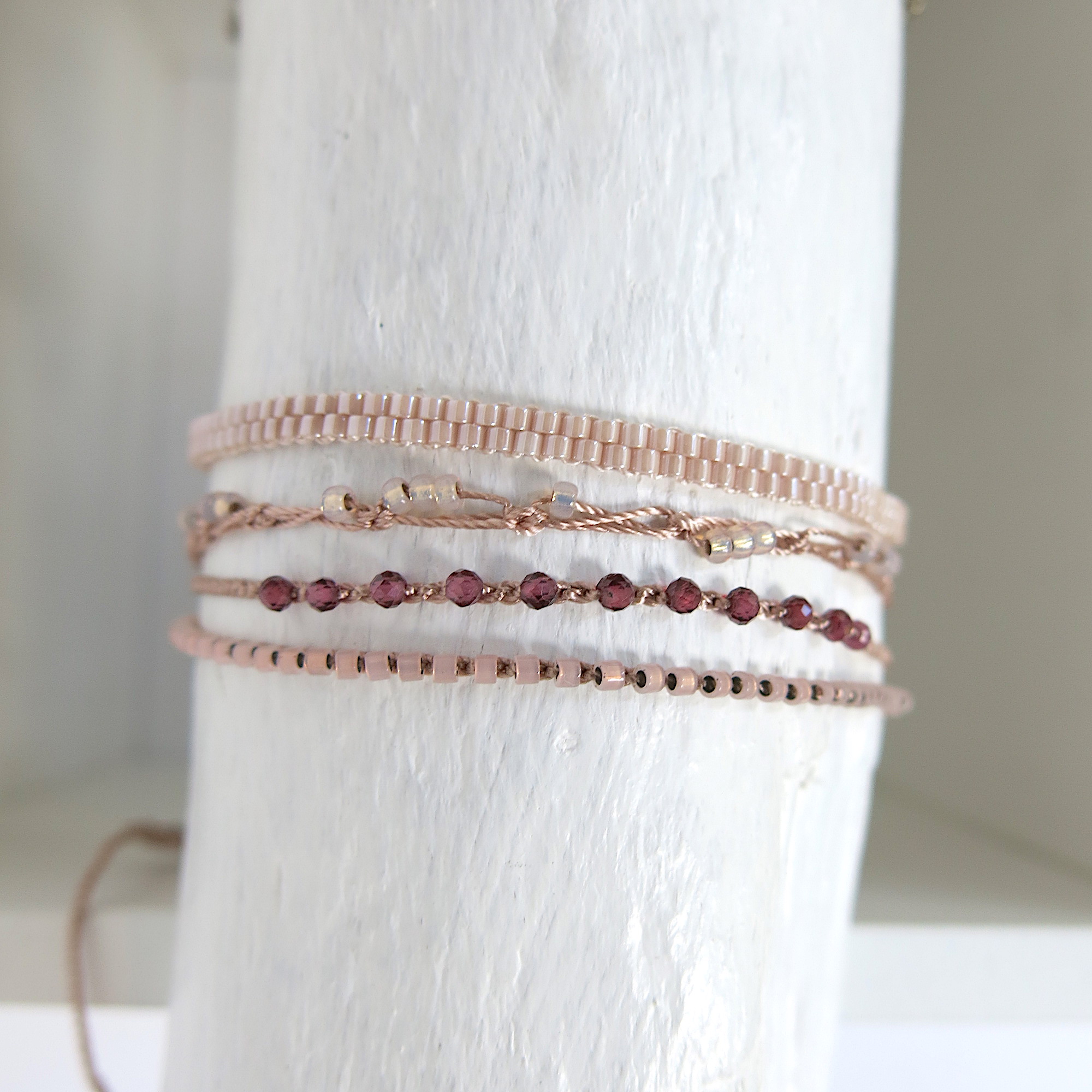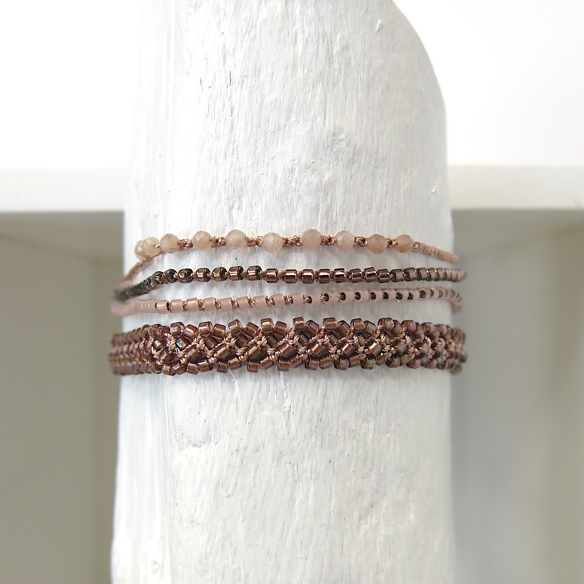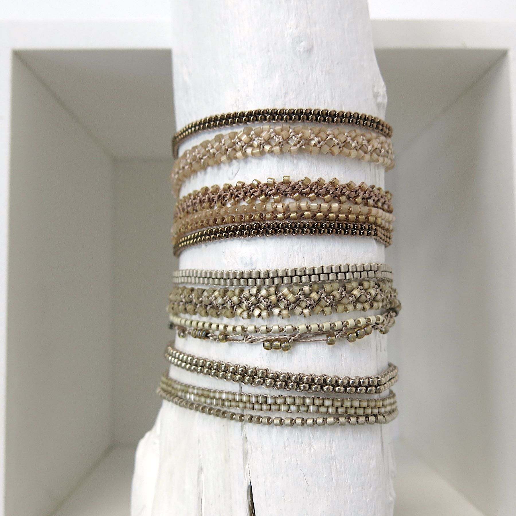 Die Armbänder sind so leicht, dass man Sie immer tragen kann. Selbst zum Duschen, Baden können Sie sie anlassen. Die hochwertigen MIYUKI Perlen und das feine Polyester Garn sind sehr beständig.