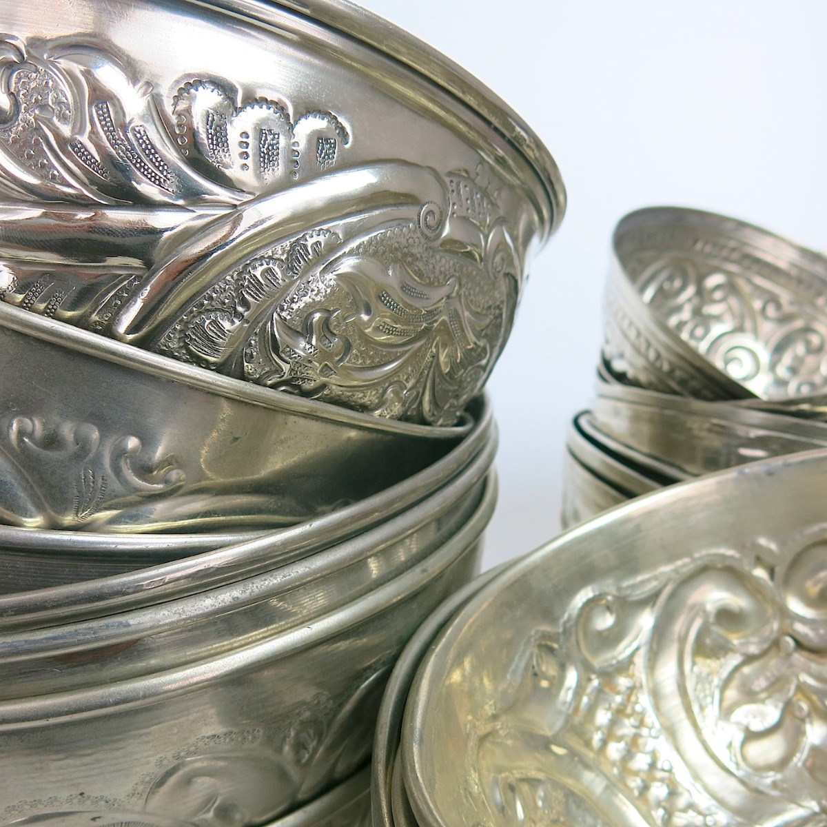 Diese Art der Hamamschale wird teils aus ‚alten Zuckerdosen Deckeln‘ umfunktioniert – also eine Art ‚upcycling‘. Das Material ist das in Marokko sehr häufig verwendete ‚Maillechort‘ (Legierung aus Kupfer, Nickel, Zink) – bei uns bekannt unter der Bezeichnung ‚Neusilber‘. Es sind wunderschöne verschiedene handgearbeitete Ornamente auf den Schalen – jede Schale ist ein Unikat. Dekorative Hamam Schalen für Bad, Hamam oder Sauna. Aber auch als Seifen – Schmuckschale und zum Servieren von kleinen snacks wie Nüssen etc. sehr hübsch.