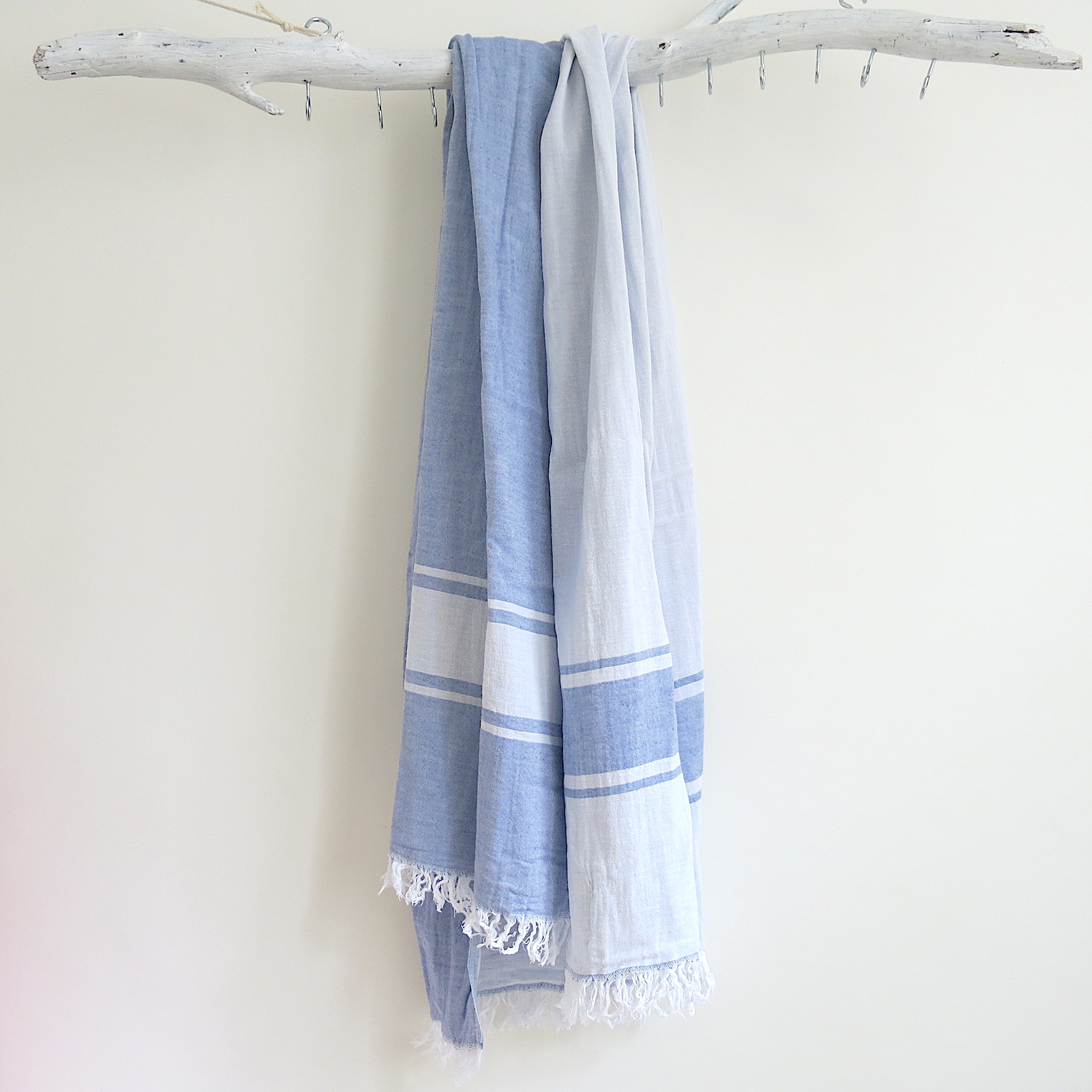 Doubleface ist ein ‚Doppelgewebe‘ – bei diesem Hamamtuch haben damit beide Seiten des Tuches eine andere Farbe – bei einer Seite liegt die Farbe (blau, dunkelgrau oder graugrün) oben und auf der anderen Seite liegt die Farbe weiß oben.