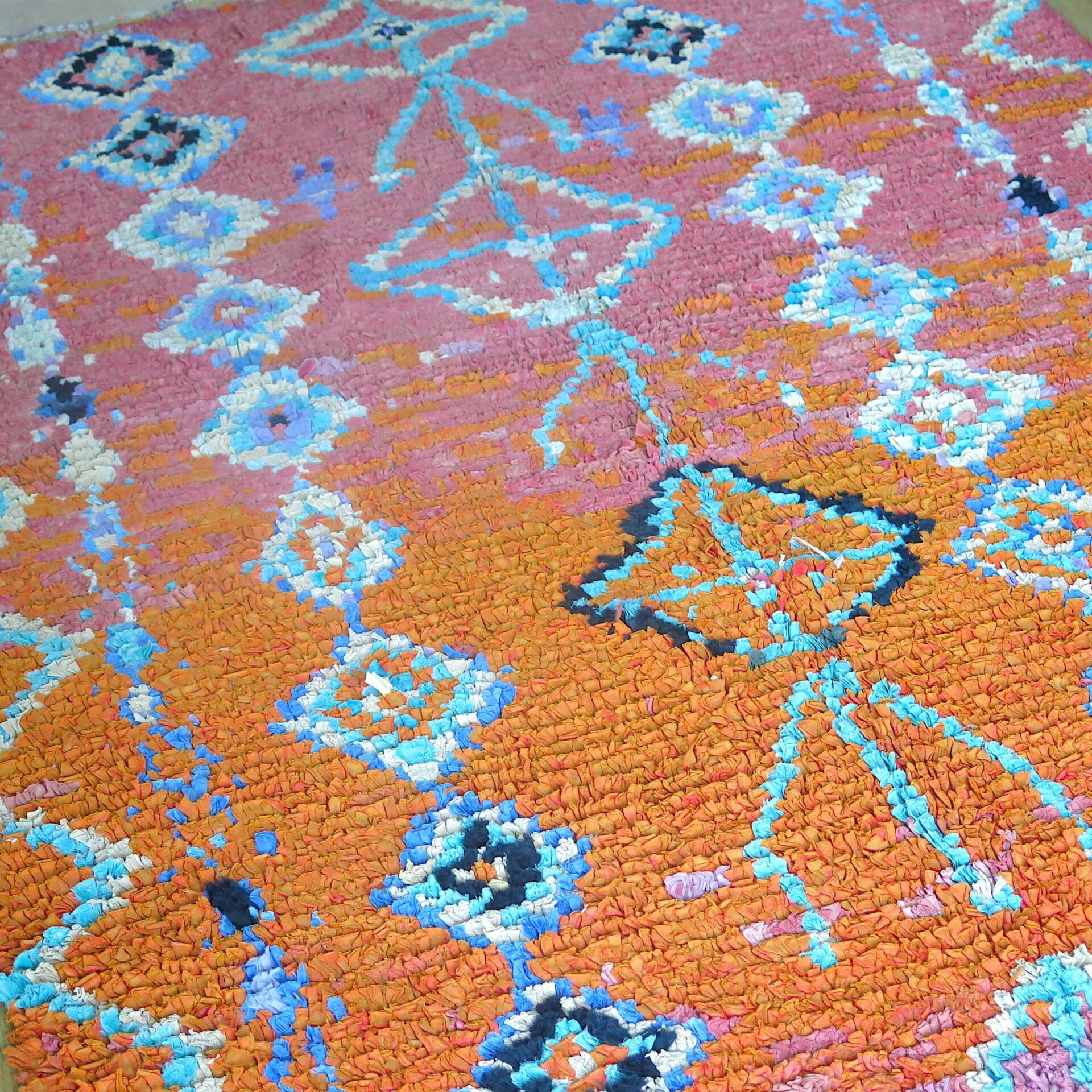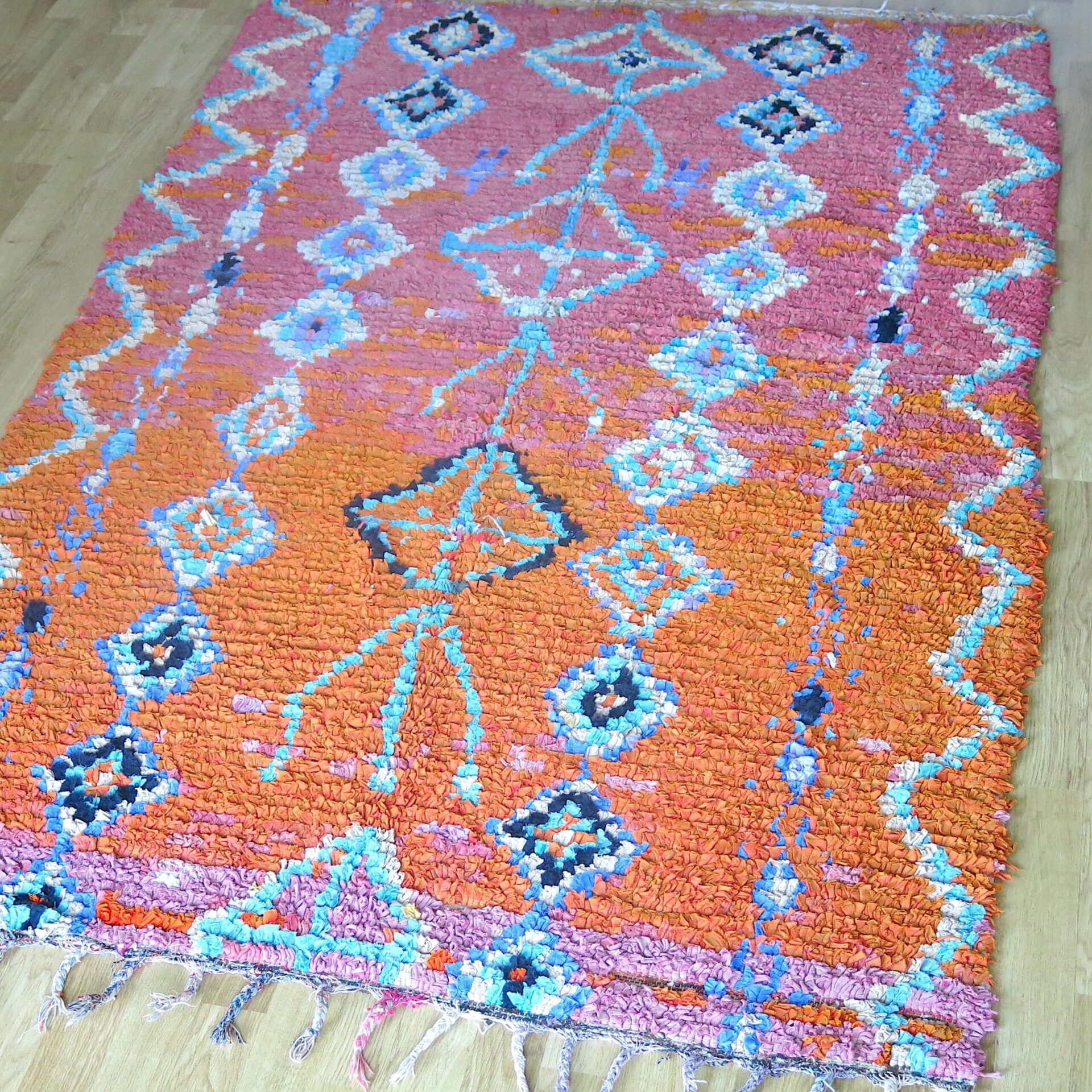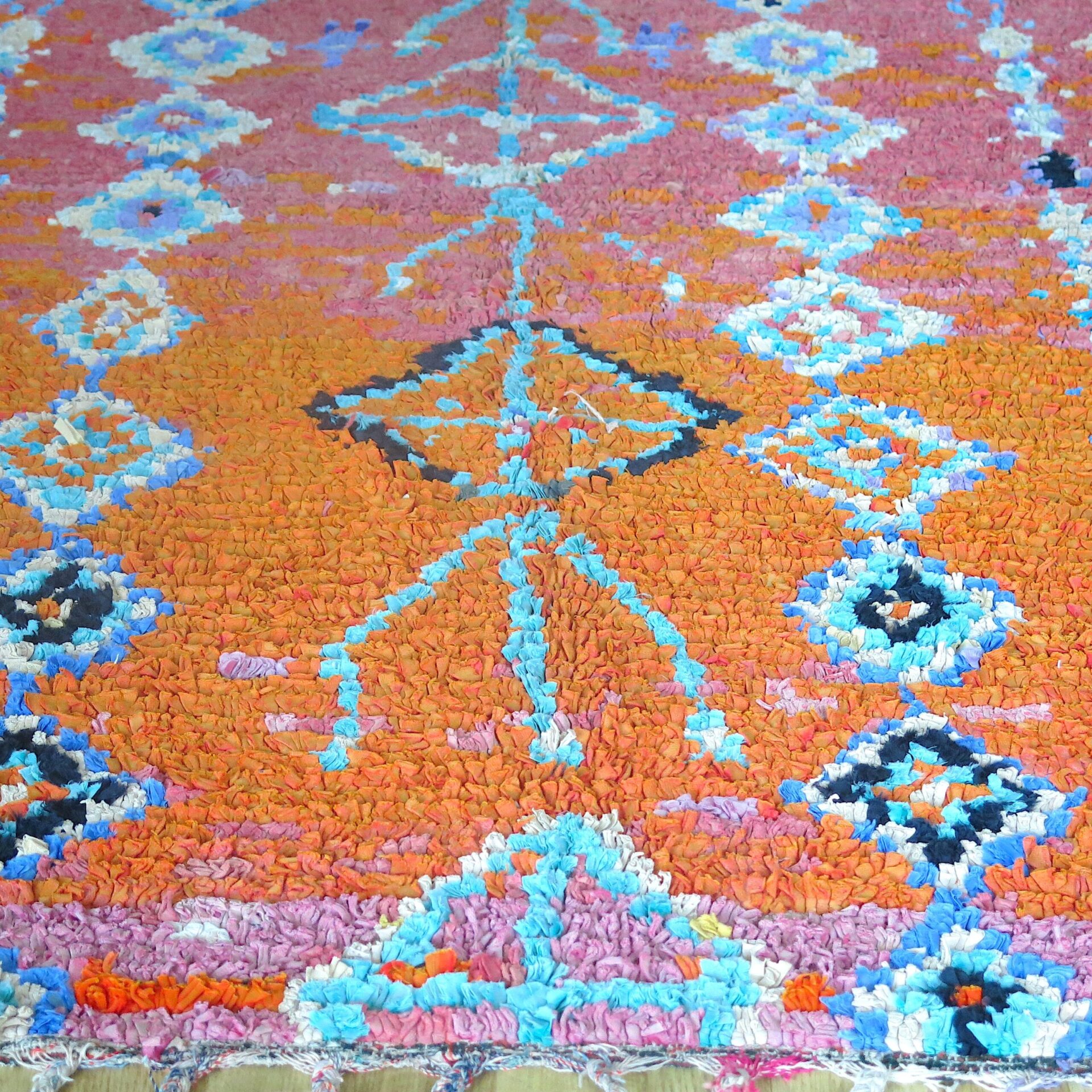 Bei einem Berber Teppichhändler im ’souk tapis‘ in Marrakech entdeckt: diesen handgeknüpften vintage Boucherouite‘ Teppich in orange-pink Farbverlauf.