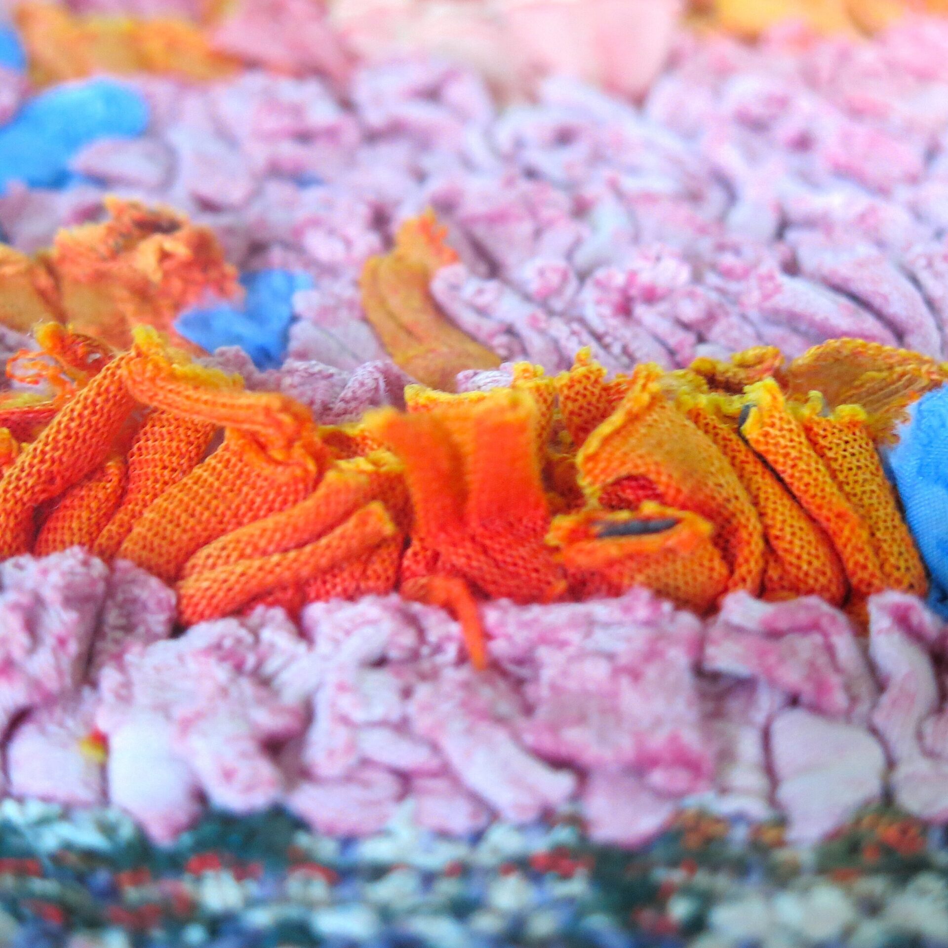 Es handelt sich um eine Art Flickenteppich, der üblicherweise aus Stoffresten geknüpft wird. Die Oberfläche ist dann wie bei einem Flokati Teppich mit längeren Fasern.