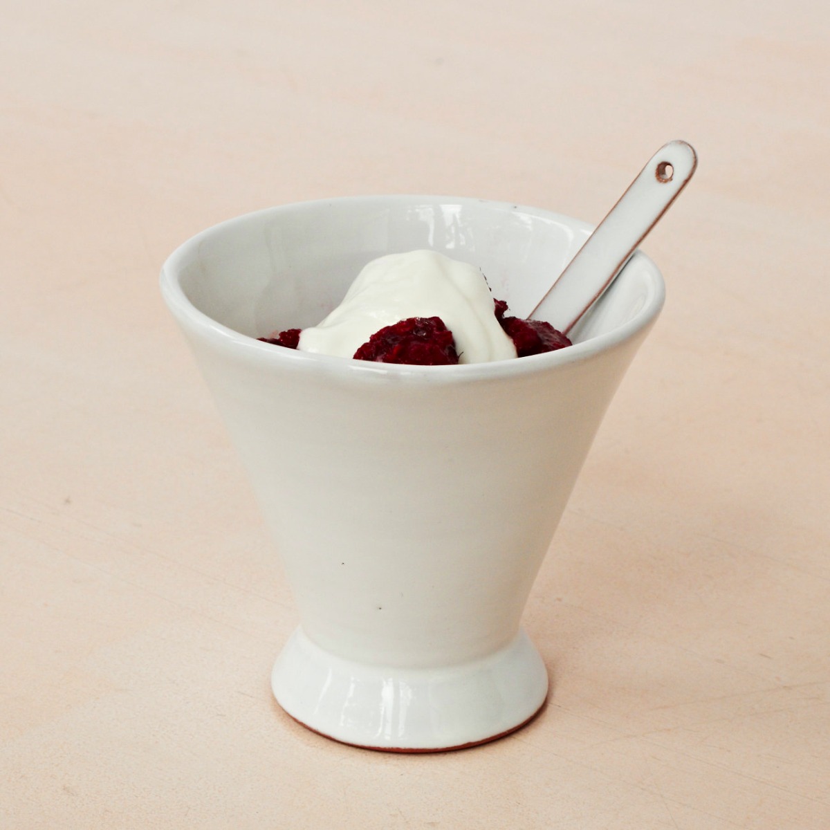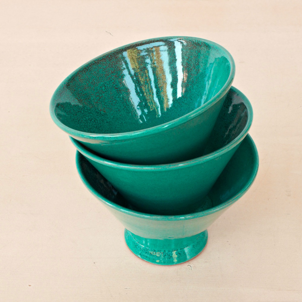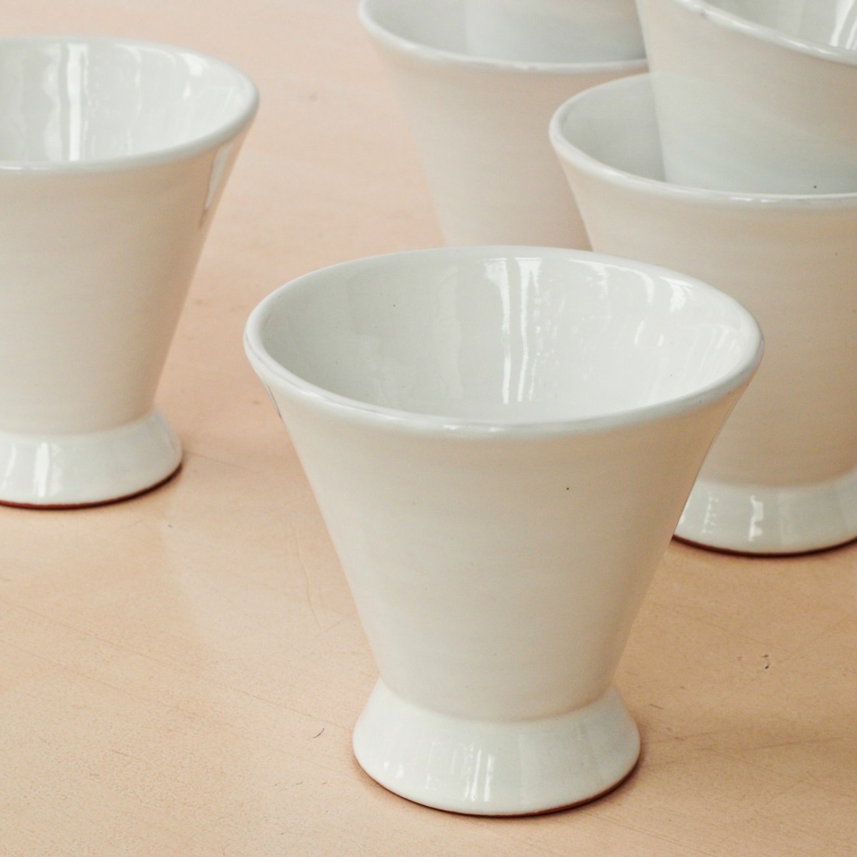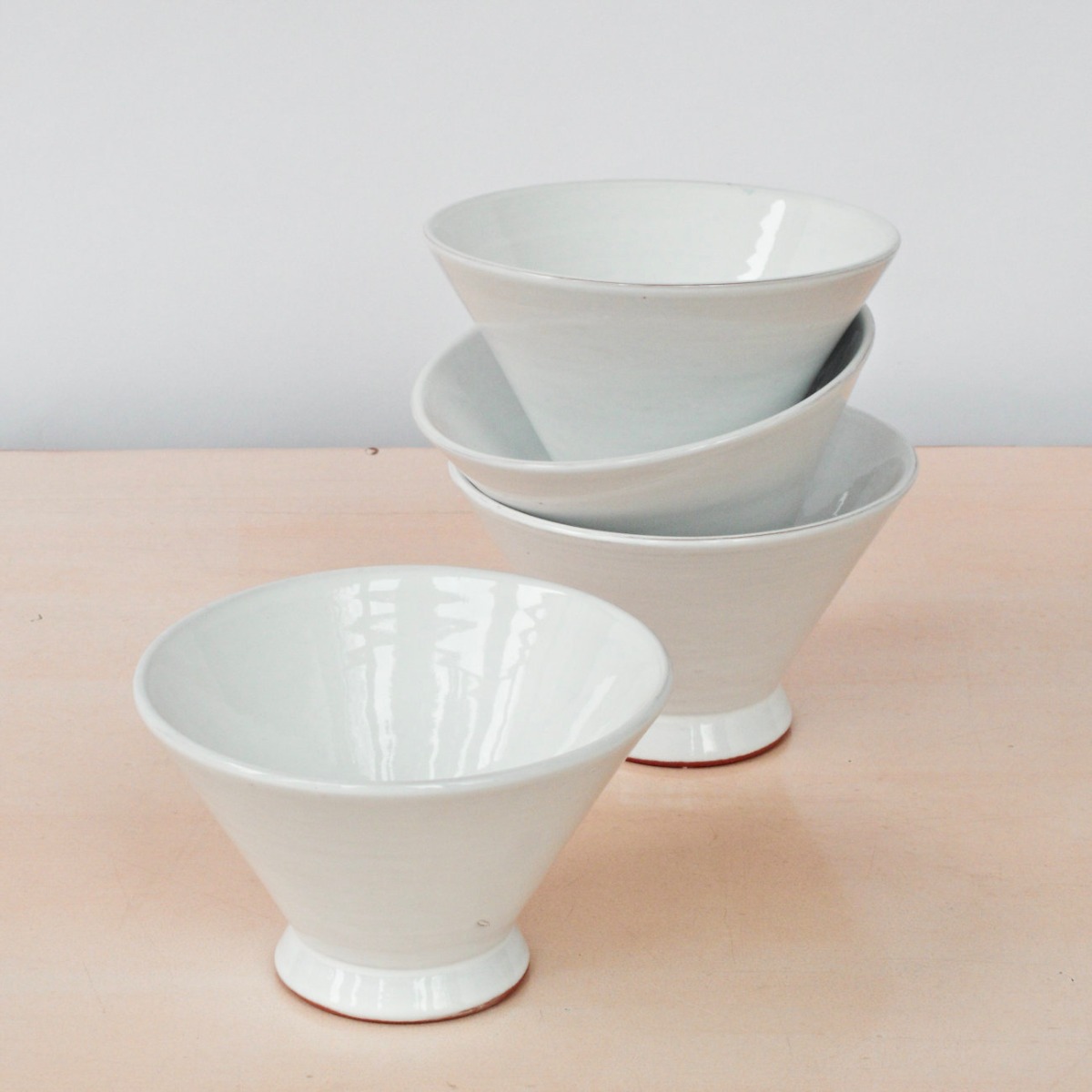 Diese Schalen habe eine besondere Form – sie haben einen Fuß und sind leicht ‚trichterförmig‘. Es gibt vier verschiedene Größen: XS, S, M und L. Größe L ist sehr schön als Salatschüssel oder Servierschale geeignet. Die kleineren können divers eingesetzt werden, z.B. als Schale für Desserts, Dips, Snacks etc..
