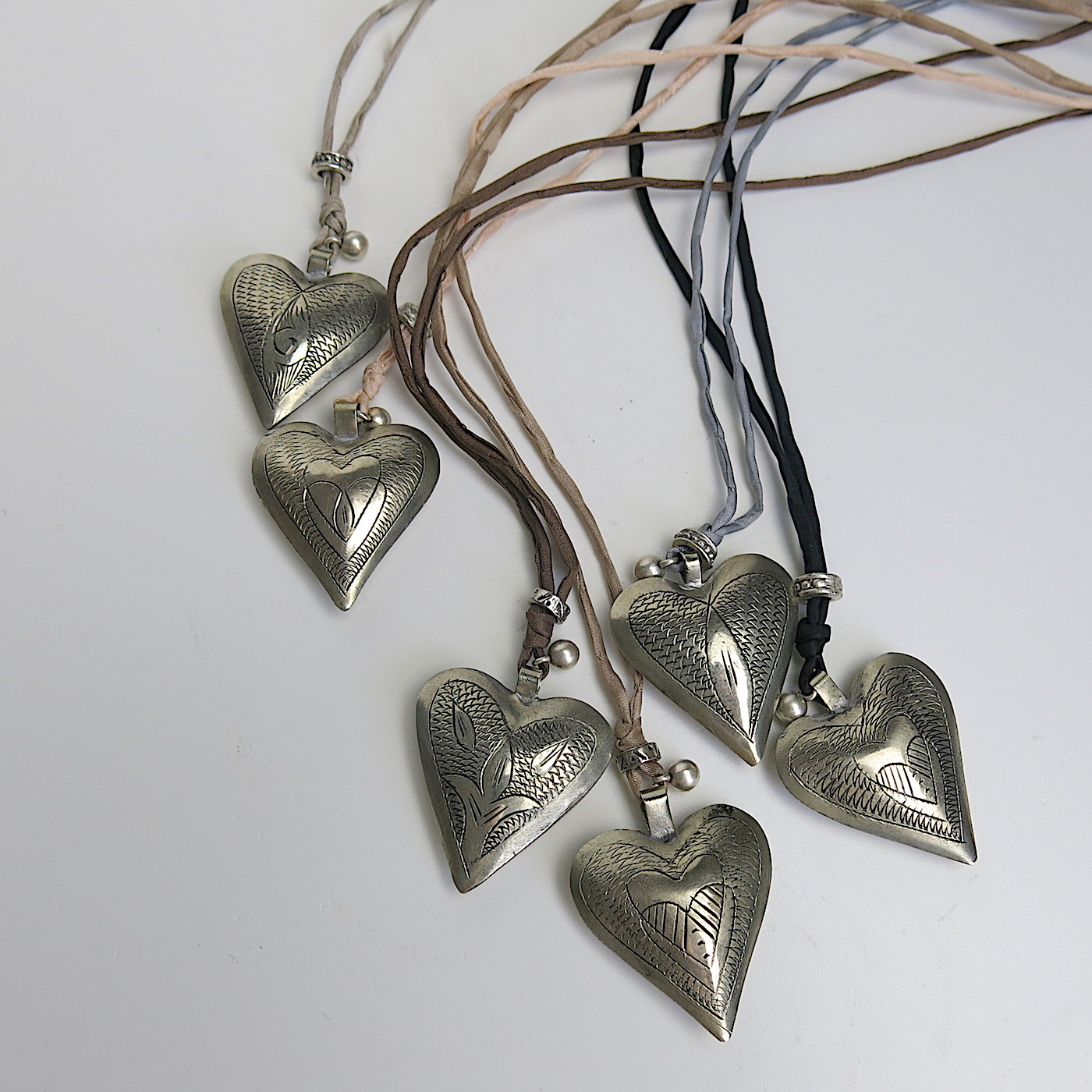 Die Herz-Anhänger haben verschiedene Gravuren (nicht farbspezifisch) und haben einen Durchmesser von ca. 3,5cm. Sie werden in Marokko in dem dort typischen ‚Maillechort Silber‘ handgefertigt.
