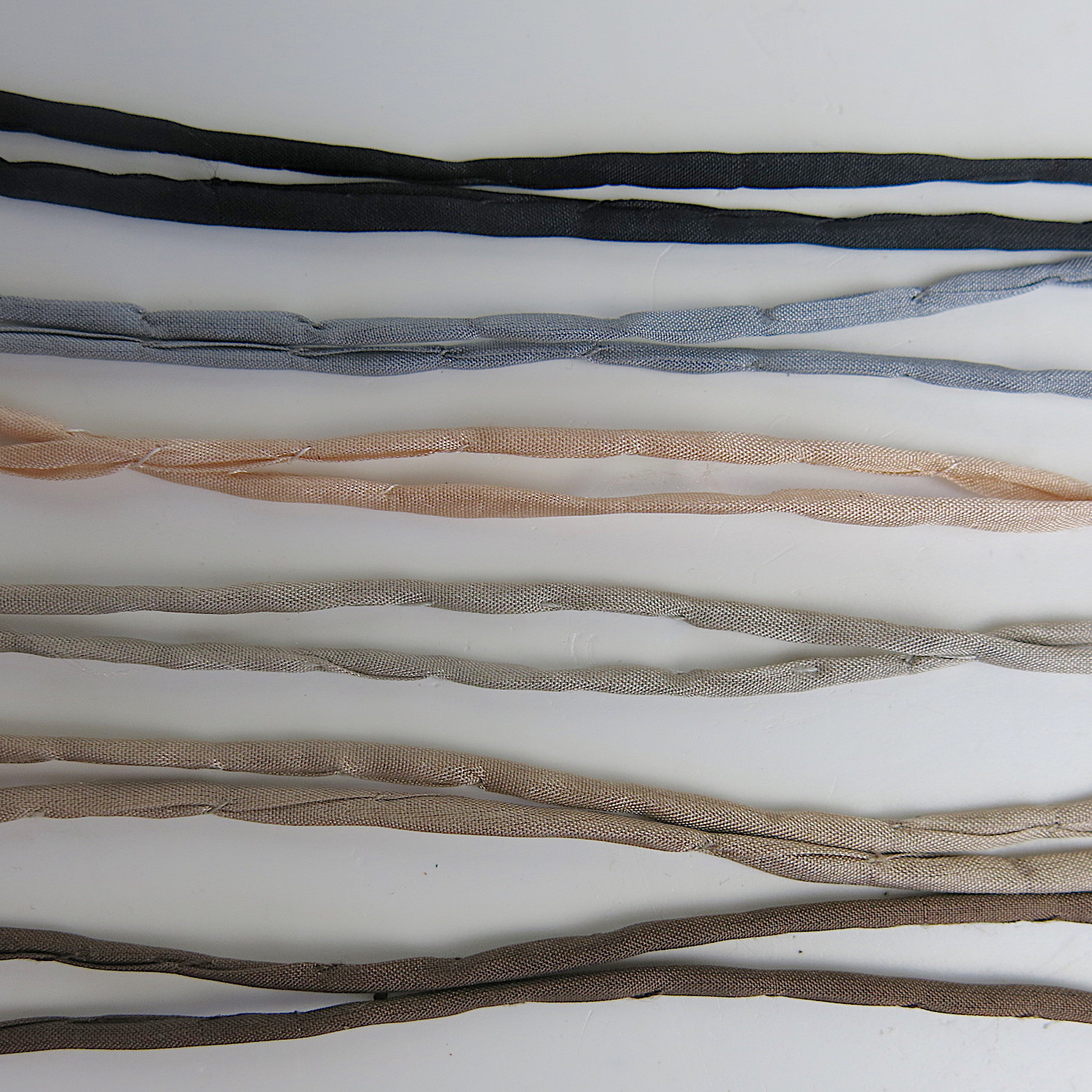 Es gibt sechs verschiedene ‚Habotai‘ Bändchen-Farben – Farbübersicht Seidenband von unten nach oben: dunkelbraun, beige, hellrosa, grau und schwarz