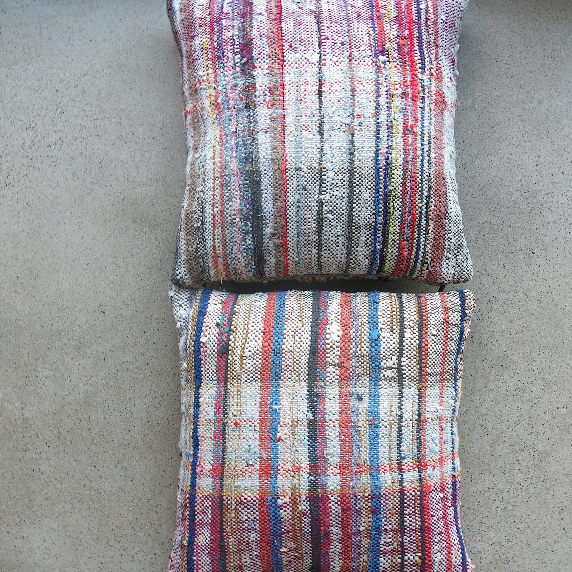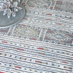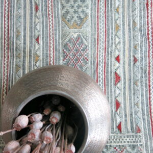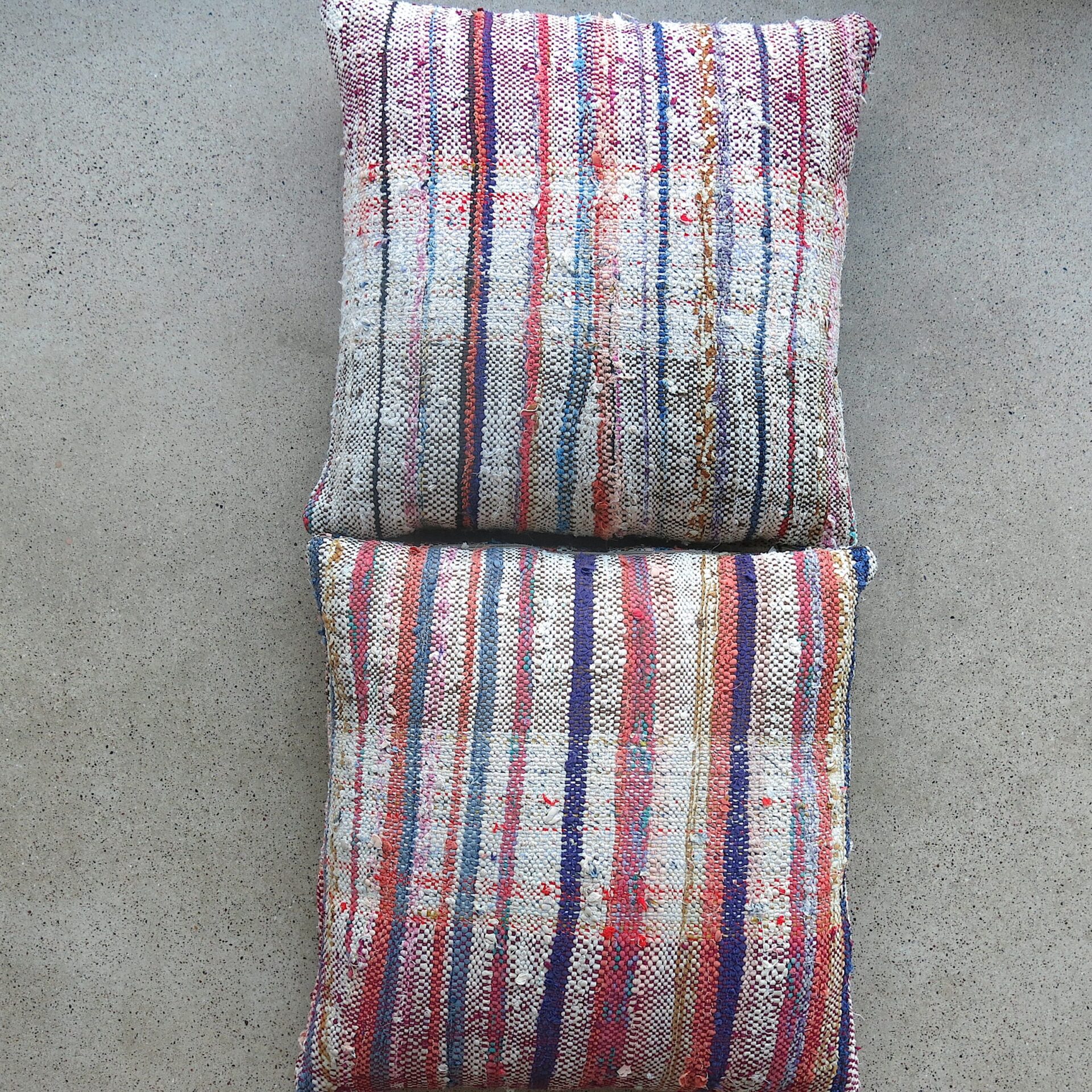 Die Kissen fertige ich aus alten handgewebten Berber Decken bzw. Teppichen, die ich vor Ort in Marokko immer wieder entdecke. Bei diesem Kissen handelt es sich um einen Kelimteppich, der teils aus Baumwollgarn und Stoffresten Baumwolle gewoben wurde. Dadurch entsteht die schöne bunte Farbigkeit und die ‚Unregelmässigkeit‘ in der Leinwand-Webart.