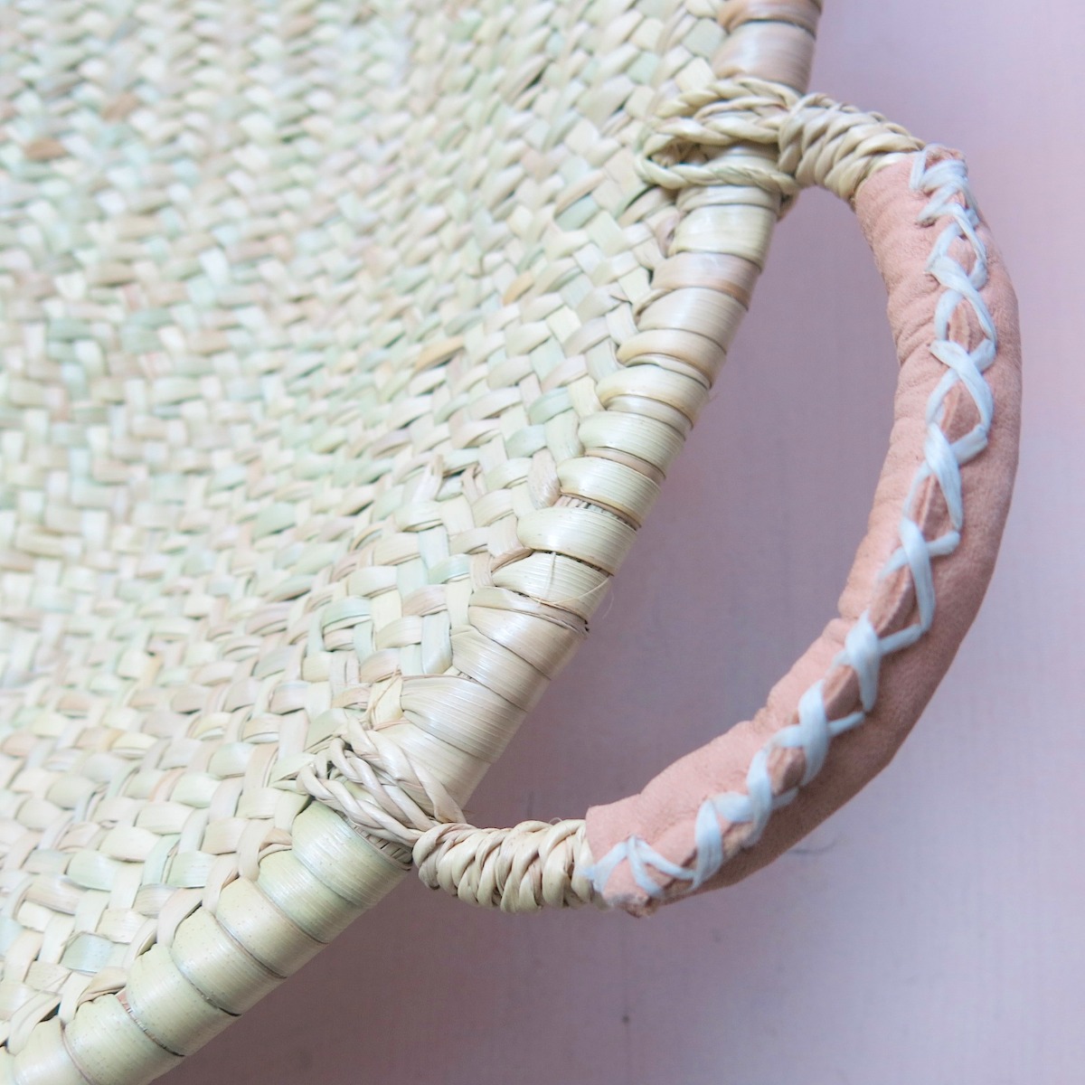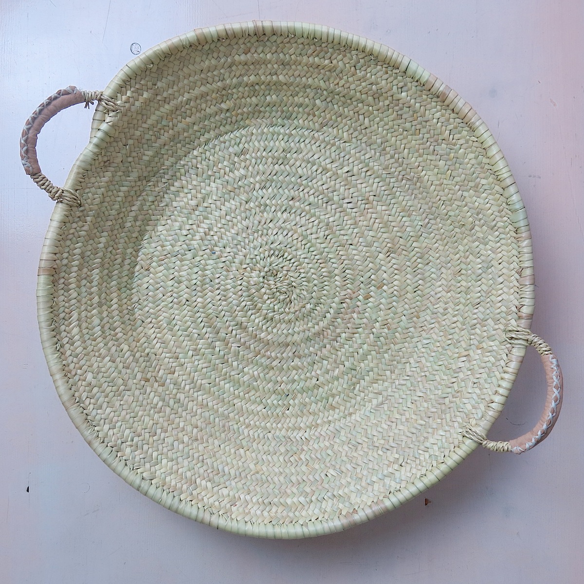 Dieser flache Korb ist im Vergleich zu dem anderen flachen Korb INTBAS0005 von der Verarbeitung her noch etwas ‚akurater, cleaner, feiner‘ gearbeitet. Außerdem hat er als Verstärkung an den Griffen eine ‚Leder-Ummantelung‘, die mit Handstich fixiert wurde. Diese Art Korb wurde in Marokko ursprünglich für Couscous verwendet – die Bezeichnung auf Marokkanisch ist ‚Medona‘. Es ein sehr schöner Korb zum Aufbewahren für Brot, Obst etc. in der Küche oder auf einem größeren Tisch platziert. Auf dem Boden mit Zeitschriften oder anderen Dingen für den Wohnbereich ein sehr schönes Wohn-Accessoire.