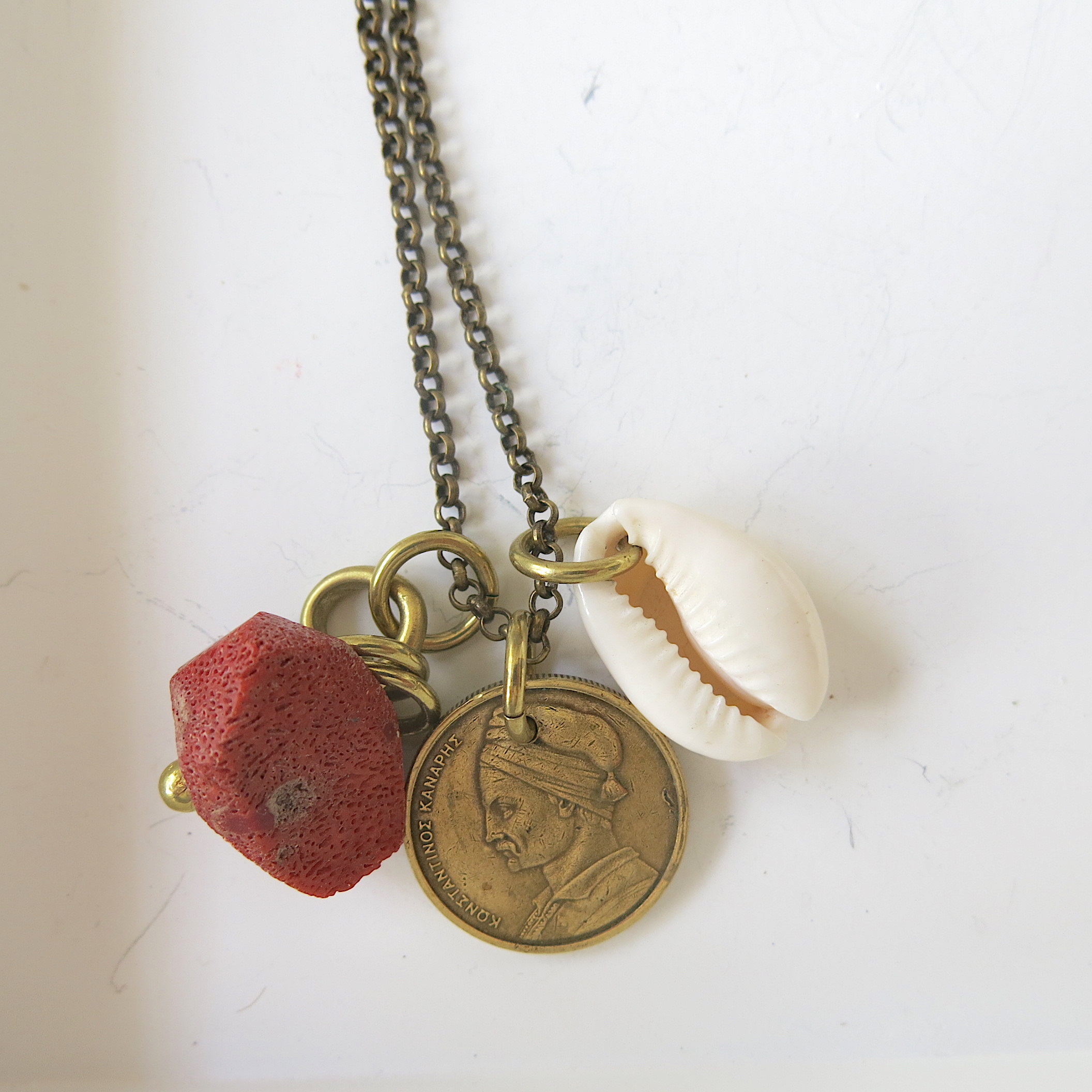 Die Ketten ‚lucky charm‘ habe ich auf Ibiza entdeckt: Viviana fertigt diese Ketten in liebevoller Handarbeit und mit viel Kreativität. Sie kombiniert alte Münzen mit Kauri Muscheln (Porzellan Muschel) und selbstgefertigten Anhängern aus Messing wie verschiedene Ringe, eine Art ‚Metallschleife‘ und verschiedene Metallstifte. Hinzu kommen – als kleiner ‚dot of color‘ – verschiedenste ausgewählte Edelsteine ‚gemstones‘. Bei dieser ‚lucky charm‘ Kette hängen die verschiedenen Anhänger an einer Messing Kette.