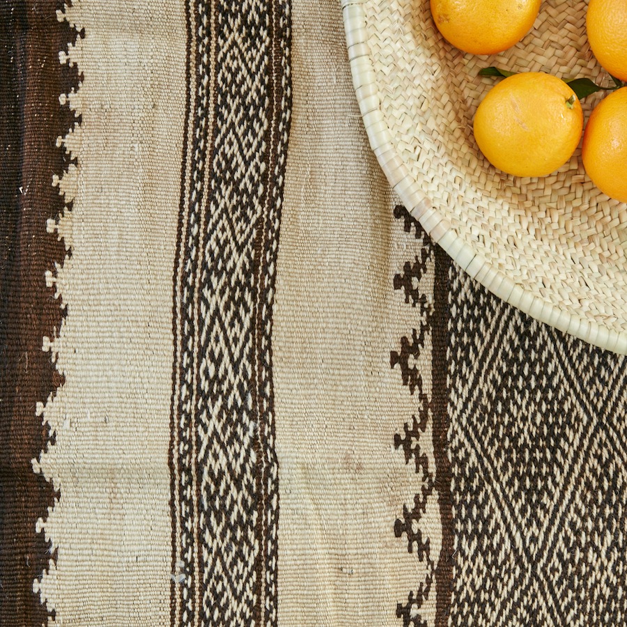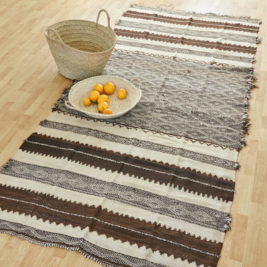 Bei einem Berber Teppichhändler im ’souk tapis‘ in Marrakech entdeckt: die ‚Sanafi‘ Teppiche aus der Sahara Region südliches Marokko. Es sind, von den dort ansässigen Nomaden handgewebte Teppiche, die in den Zelten teils als Decken-, Wandbehang oder auch für den Boden verwendet werden. Sie sind sehr viel leichter und dünner als die typischen marokkanischen Kelim Teppiche. Als Wolle wird eigen gesponnene Schafwolle und teils auch Ziegenwolle verwendet – der Anteil des Ziegenhaares ist aber eher gering.