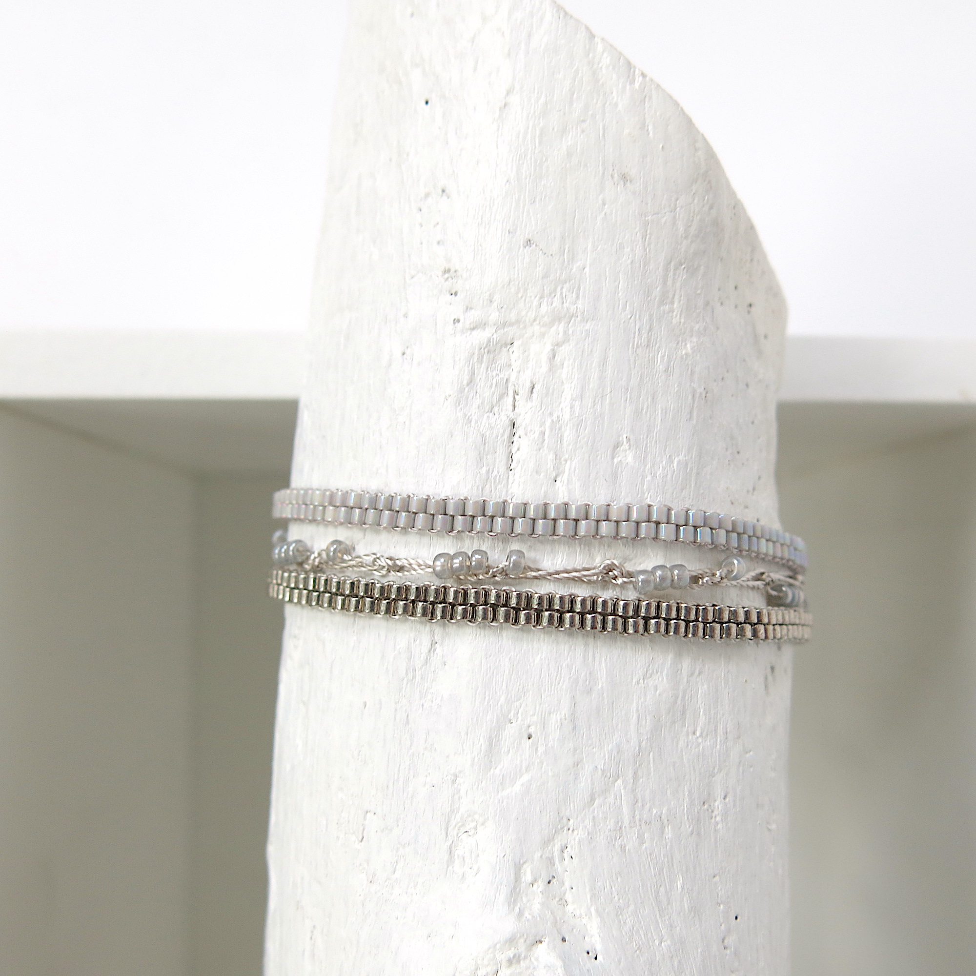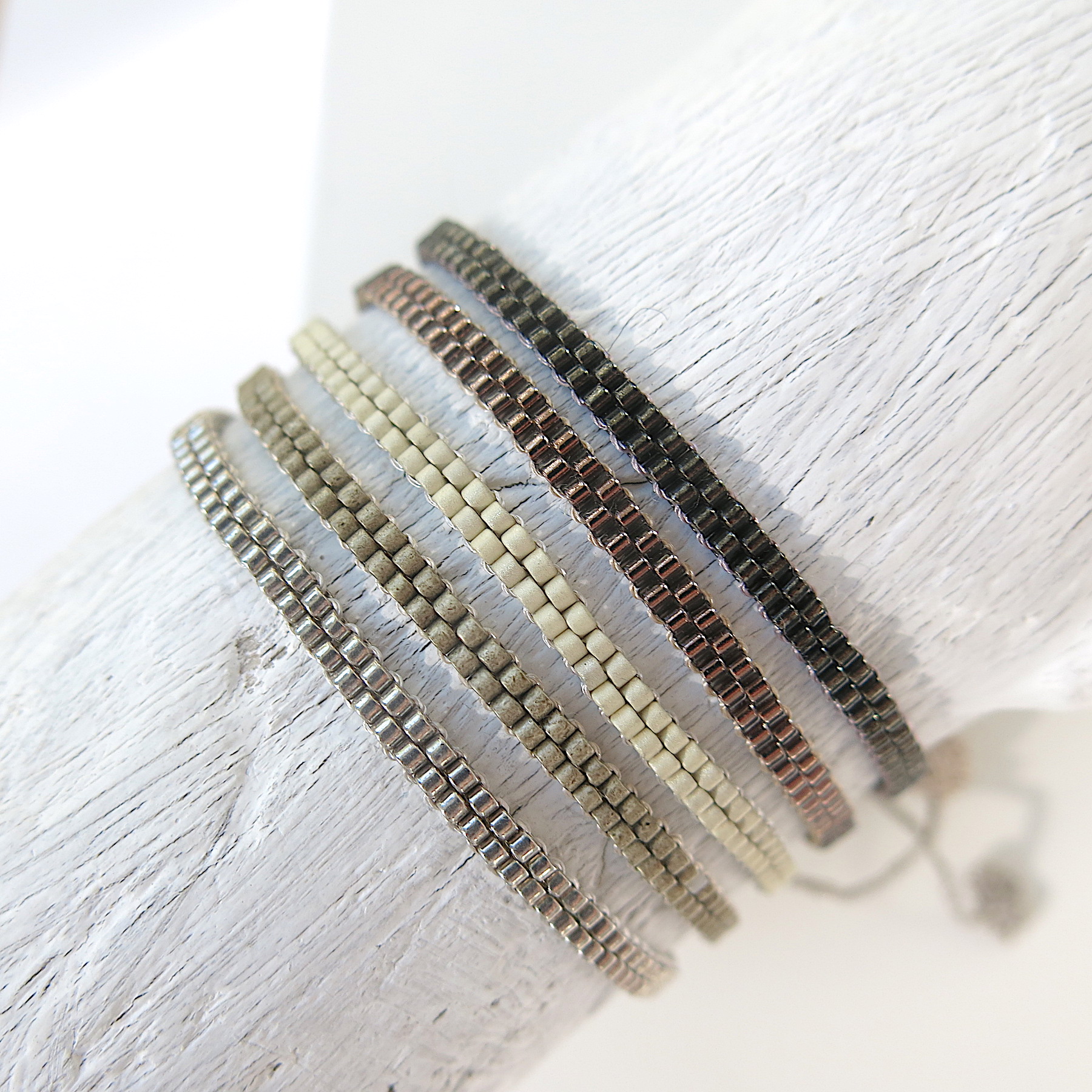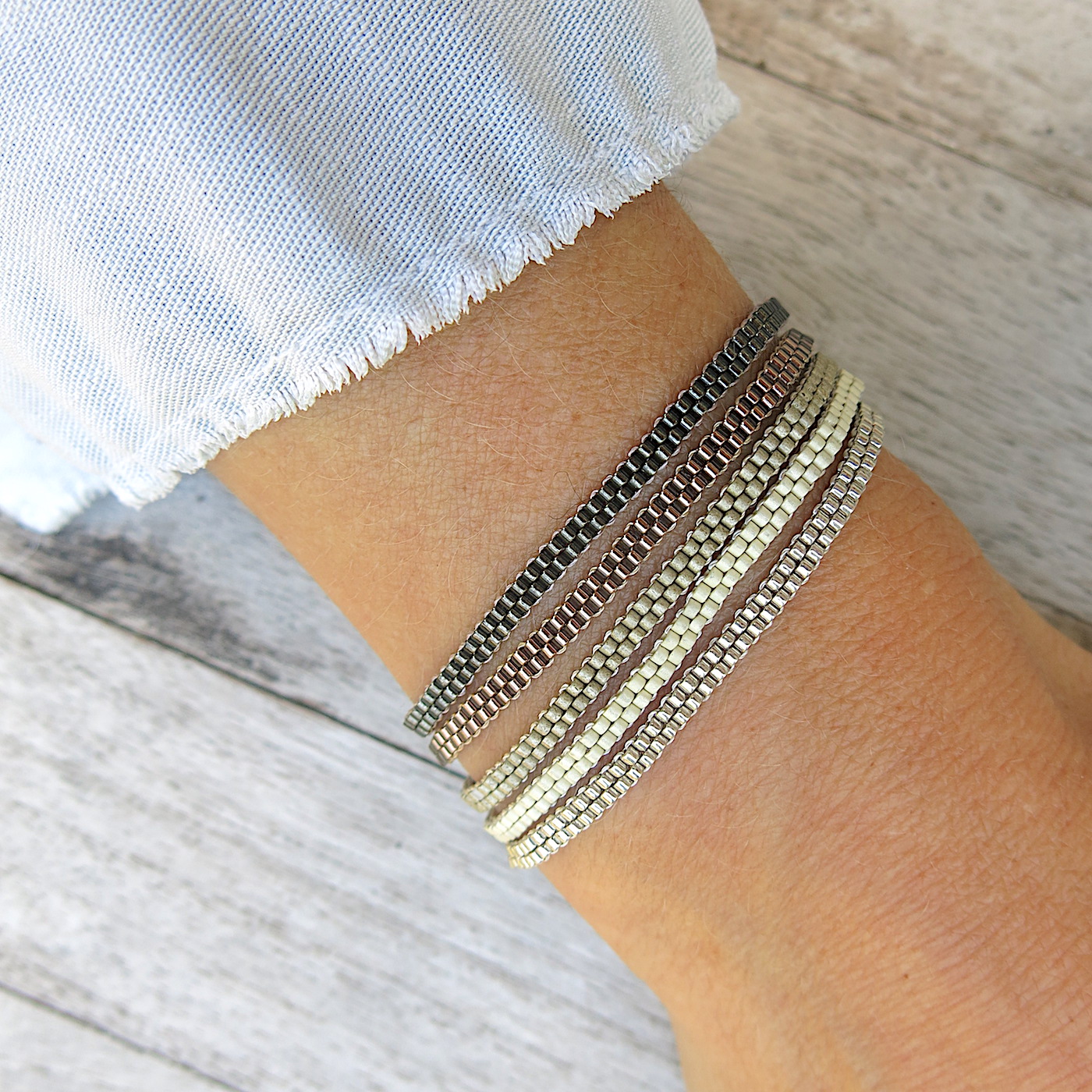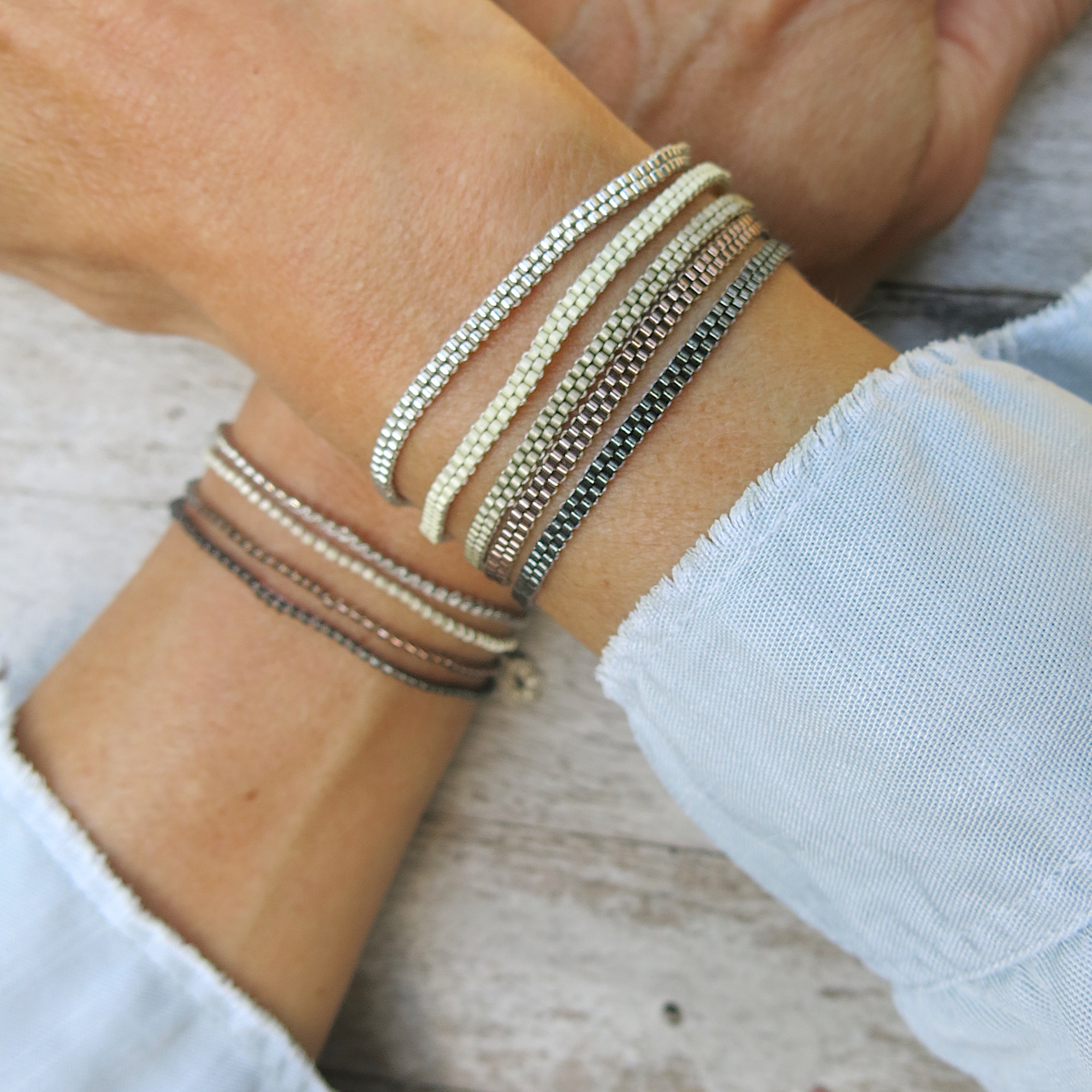 Die 1,6mm MIYUKI Delica Perlen haben einen metallischem Schimmer (kupfer, schwarz) und sind galvanisiert (pewter, weißsilber). Die Armbänder im ‚metallic look‘ setzen einen besonderen Akzent und lassen sich zu allem gut kombinieren.