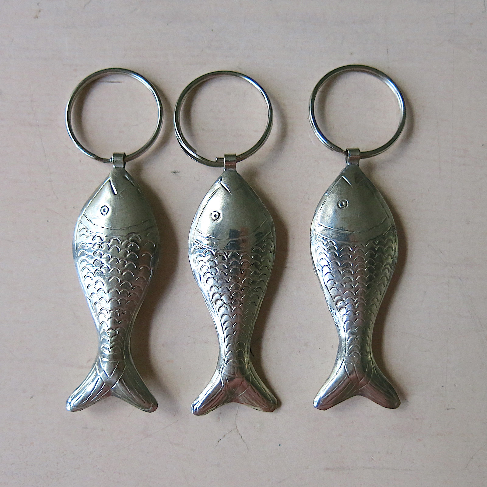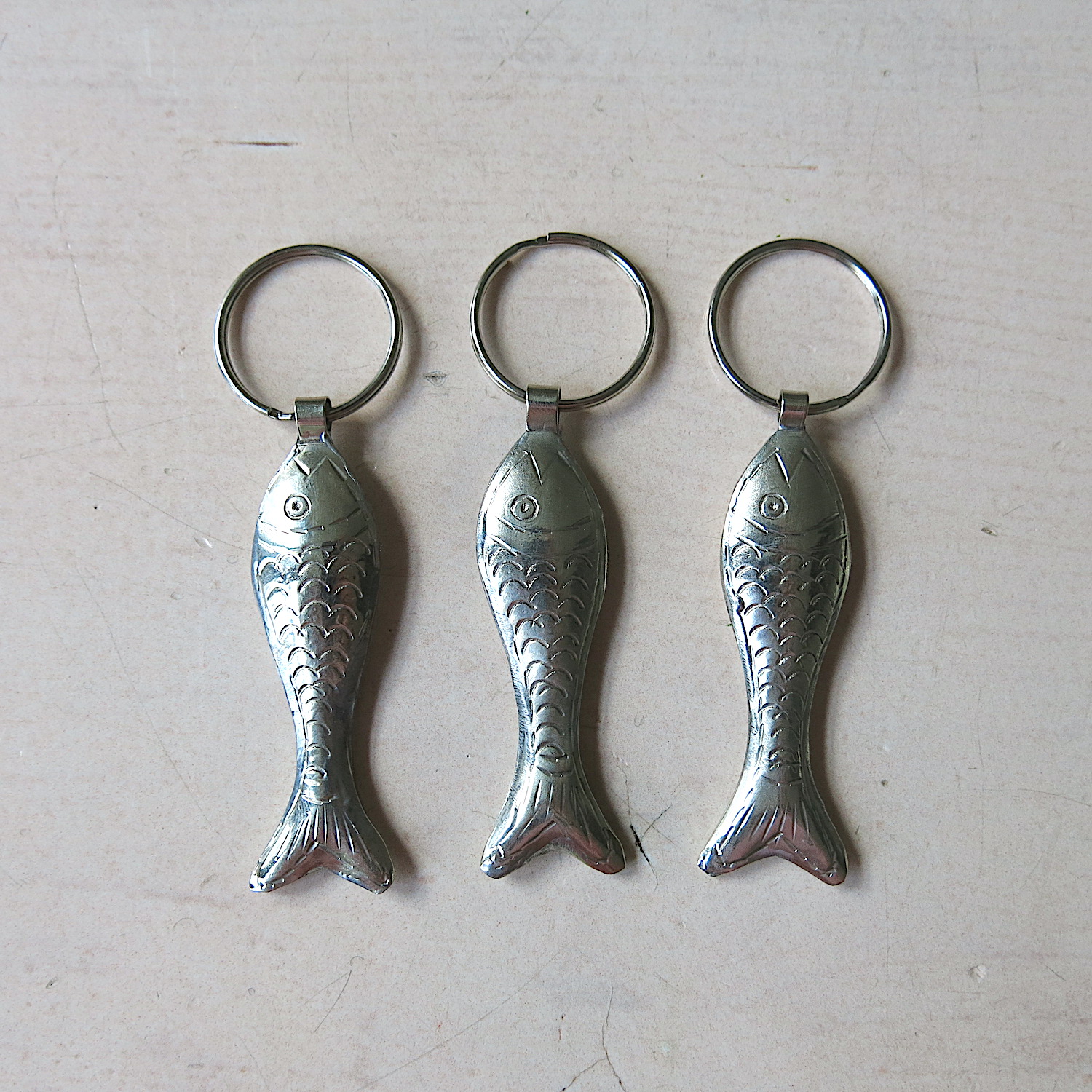 Die Schlüsselanhänger aus ‚Maillechort Silber‘ werden handgefertigt. Die Anhänger sind nicht ‚massiv‘, sie sind innen hohl und damit schön leicht.