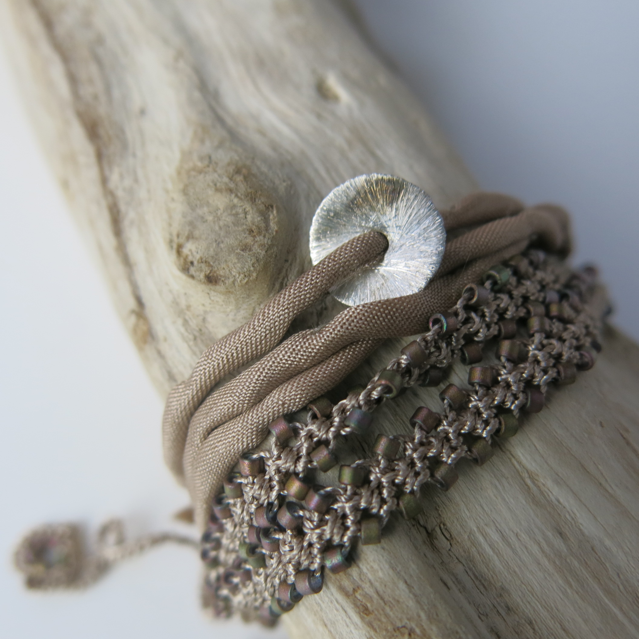 An diesem Habotai Seiden-Armband ist ein fein geriffeltes Silberplättchen von ca. 1cm DM als Anhänger.