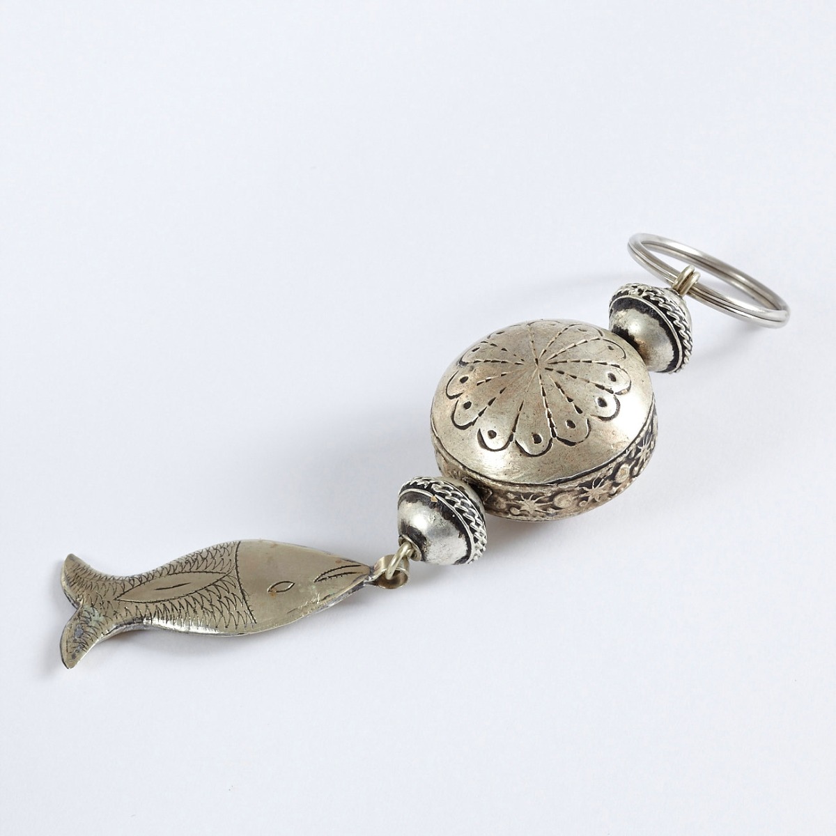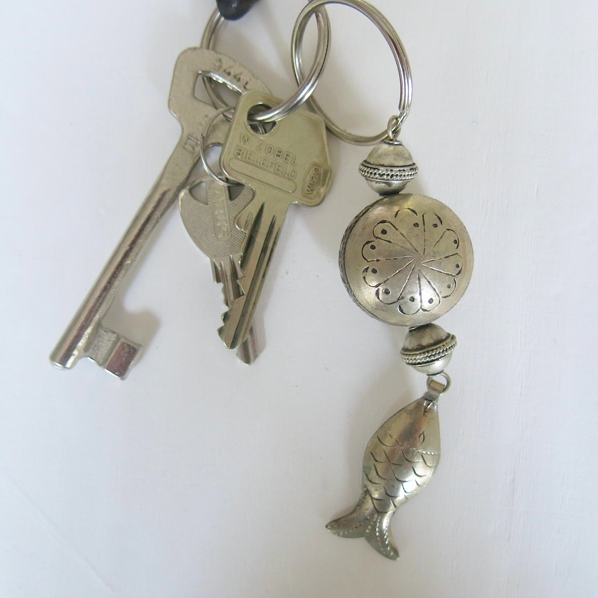 Schlüsselanhänger ‚Essaouira‘ ist ein Schlüsselanhänger aus mehreren silbernen Elementen. Essaouira ist eine kleine Hafenstadt an der Atlantikküste Marokkos – da der Schlüsselanhänger am Ende einen kleinen Fisch als Element hat, gebührt ihm dieser Name. Alle Schlüsselanhänger lassen sich untereinander sehr schön kombinieren oder Sie fügen sie zu Ihren vorhandenen Schlüsselanhängern hinzu.
