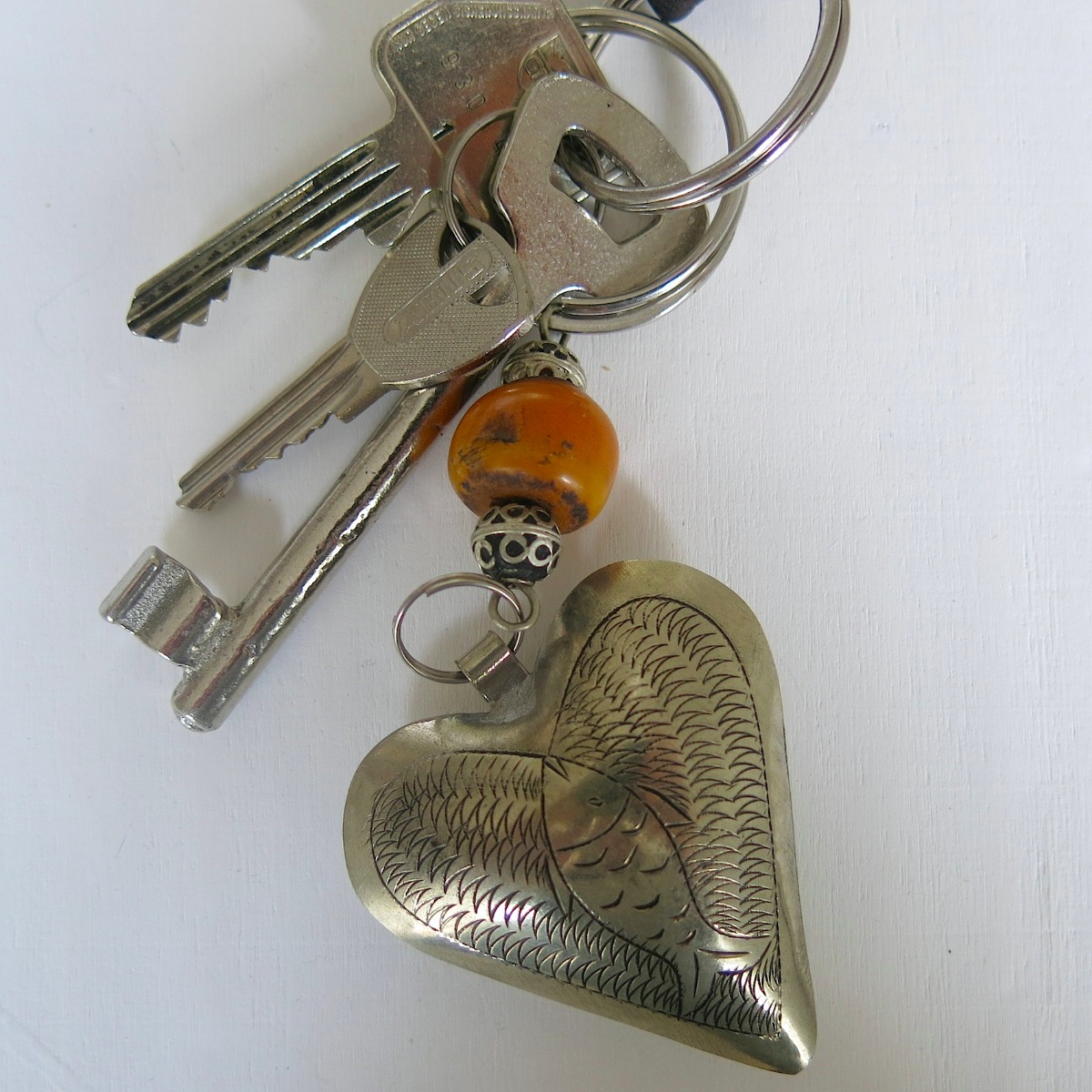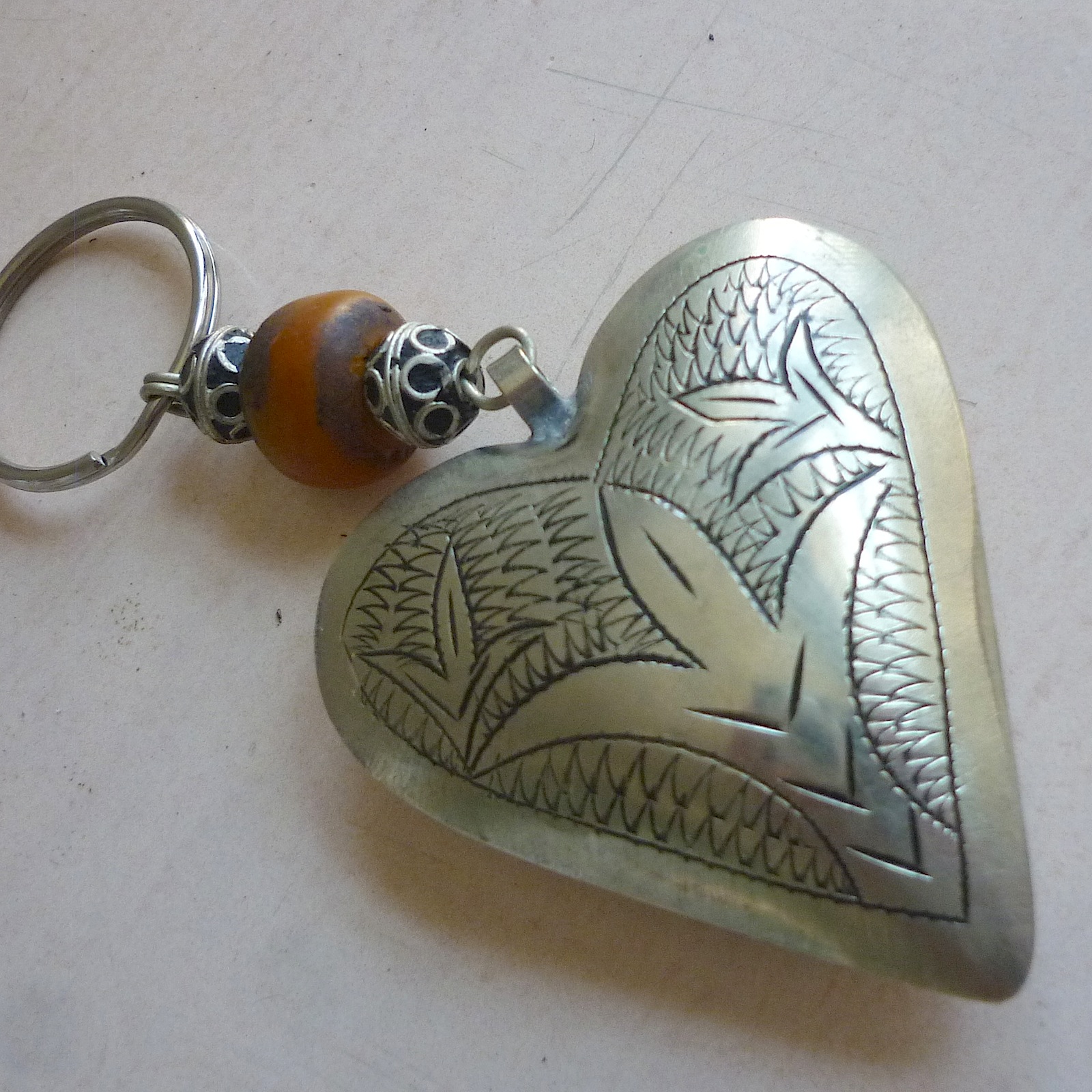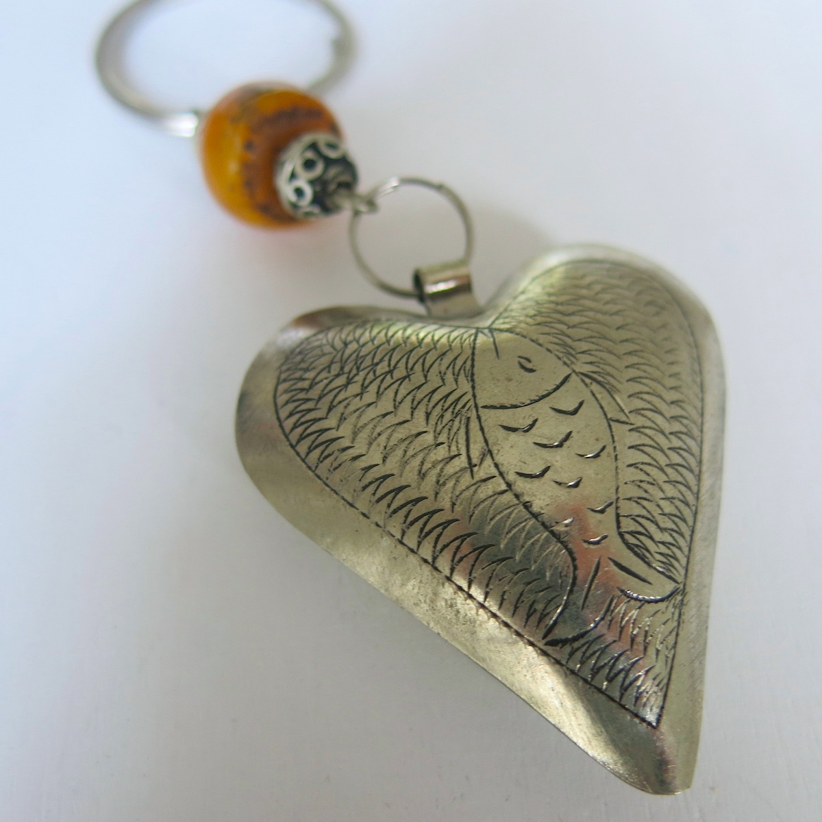 Schlüsselanhänger ‚grand coeur‘ ist das ‚große Herz‘. Er besteht als Hauptelement aus dem sehr dekorativen Silberherz, kombiniert mit kleineren Silberperlen und einer organgen Harz-Perle. Alle Schlüsselanhänger lassen sich untereinander sehr schön kombinieren oder Sie fügen sie zu Ihren vorhandenen Schlüsselanhängern hinzu.