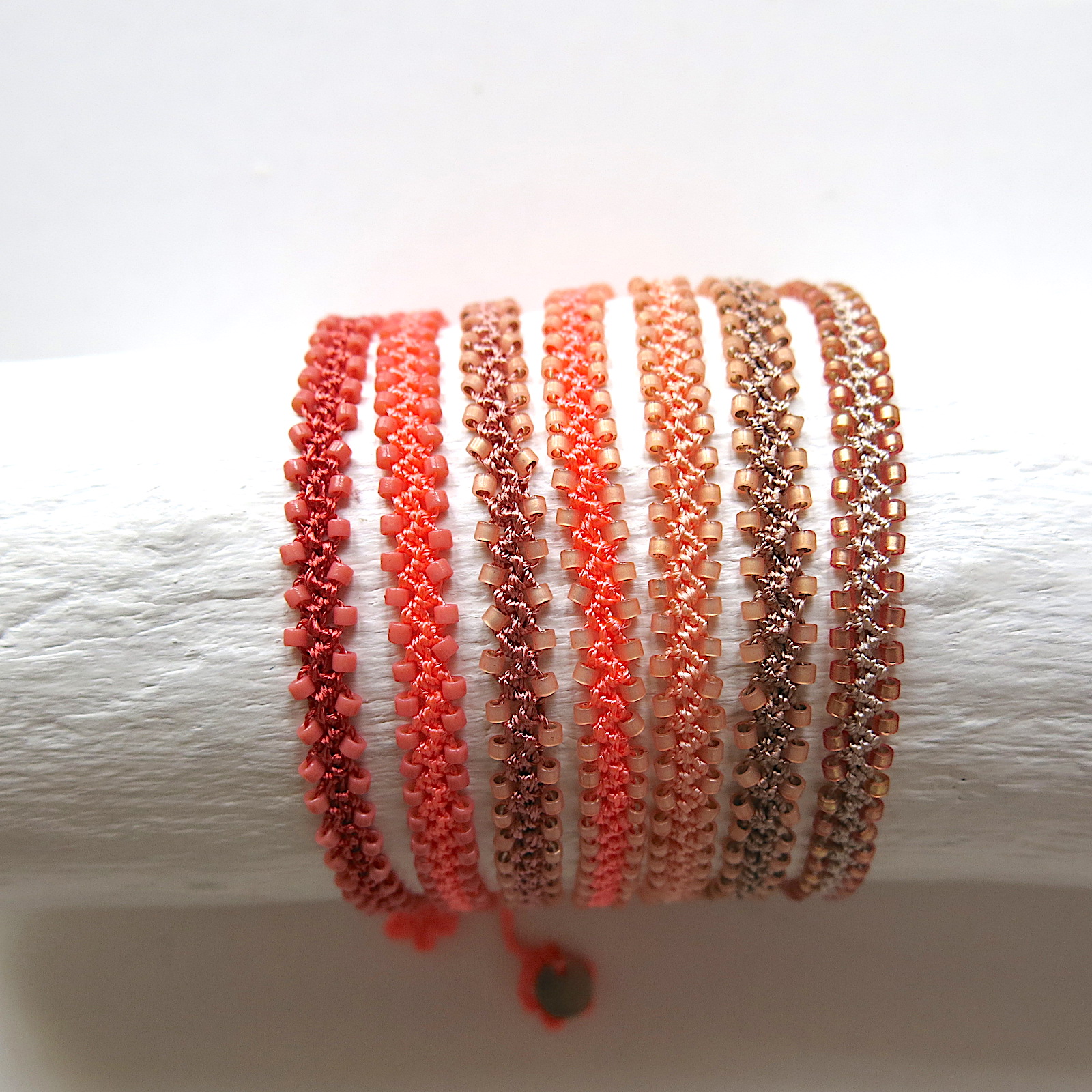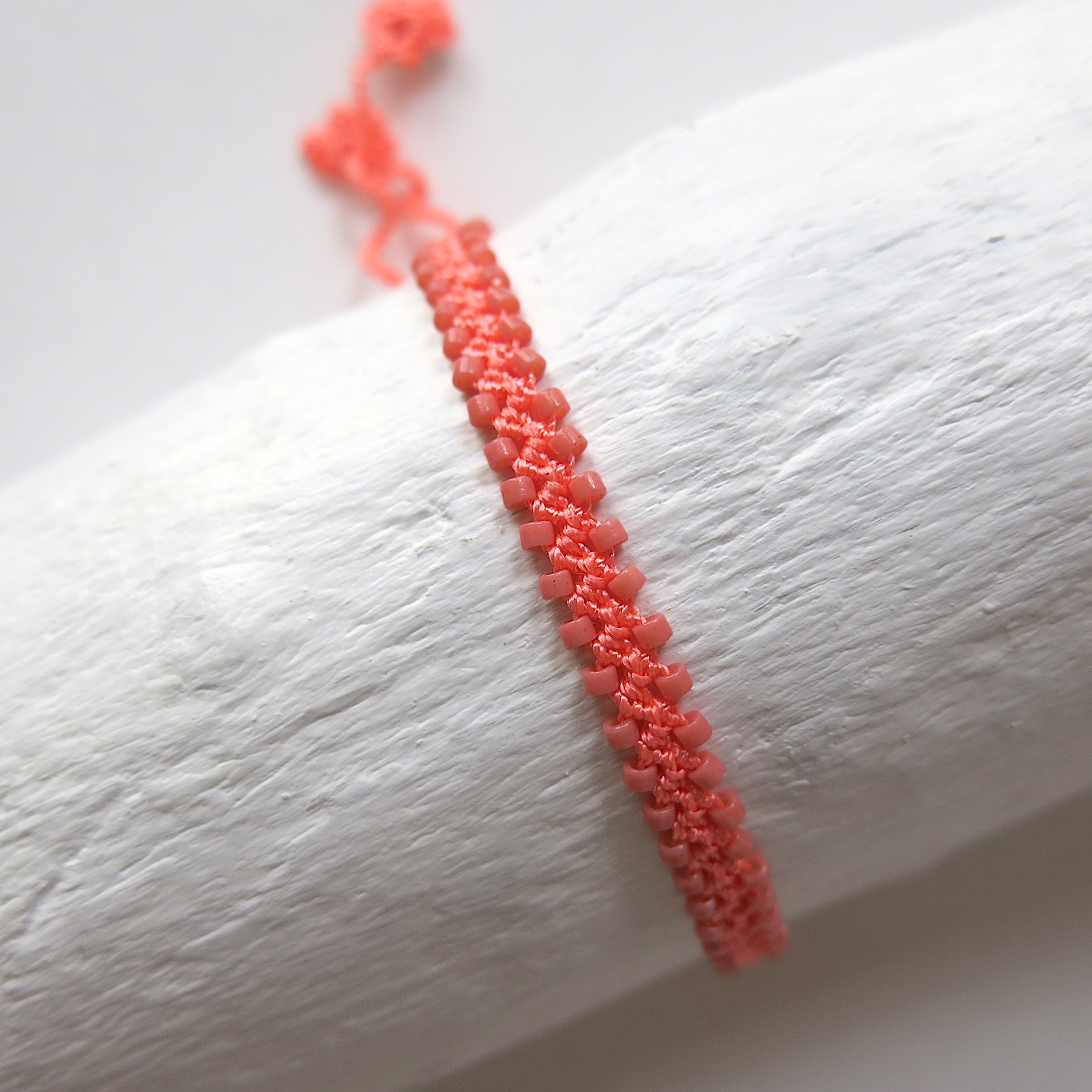 Modell ‚Isabel‘ ist ein schlichteres, feines Häkel-Armband. Dieses Armband – in verschiedenen Coral Farbtönen – ist besonders schön in Kombination mit anderen feinen Armbändern oder den Seidenbändern – es gibt einfach nur einen kleinen sommerlichen Farb-Akzent.