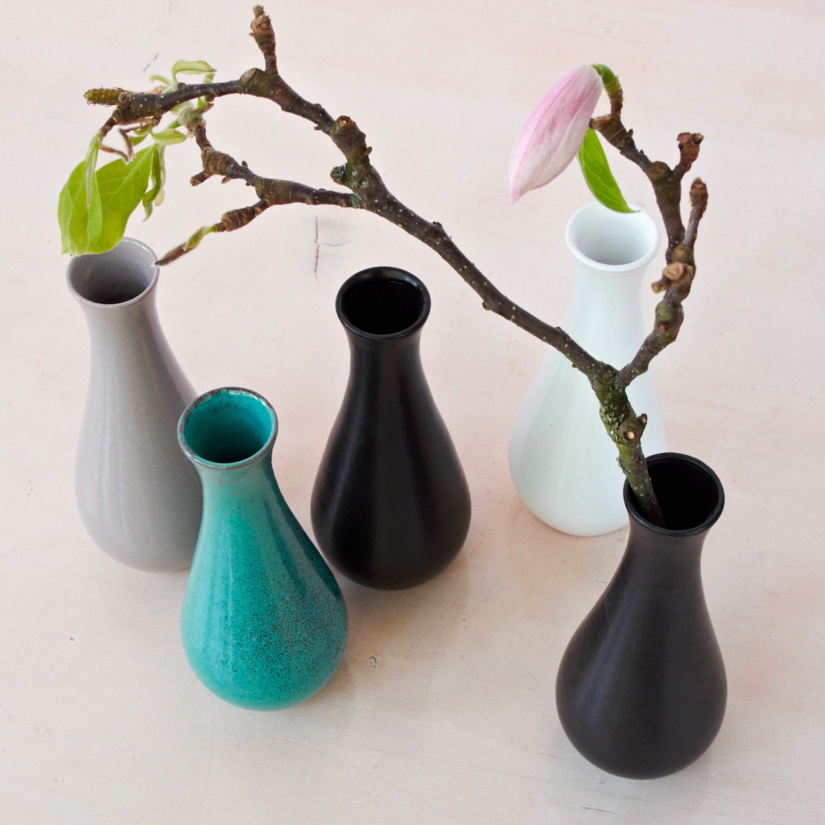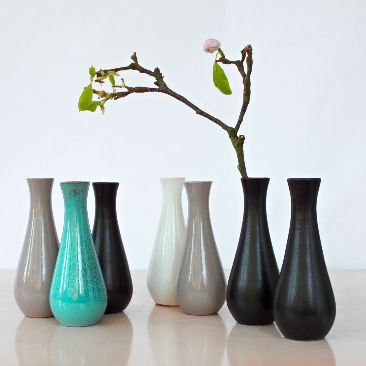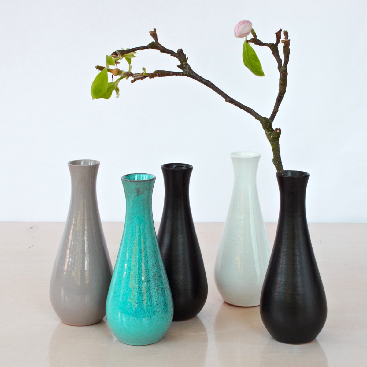 Die kleinen Keramik Vasen haben eine wunderschön schlichte Formgebung. Sie sehen toll mit einzelnen Blumen aus. Man könnte sie auch als kleine Saucengefässe oder Art ‚Sake Karaffen‘ verwenden.