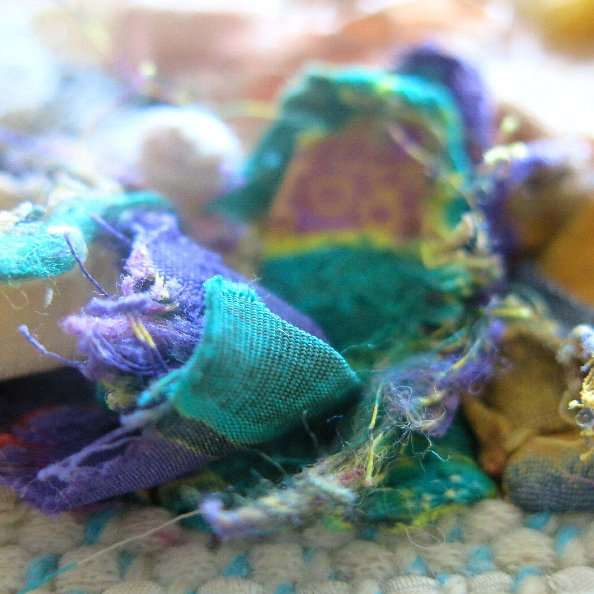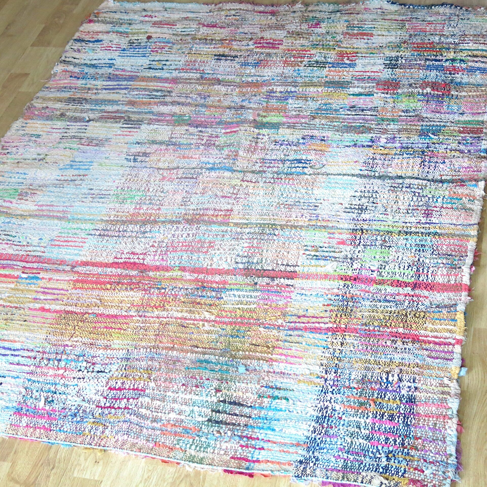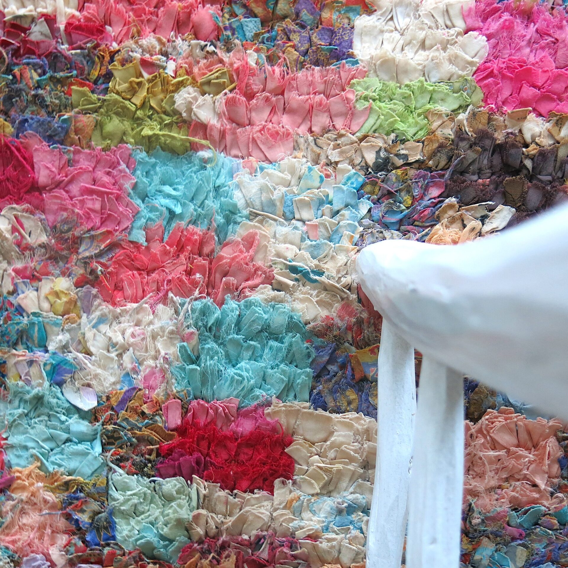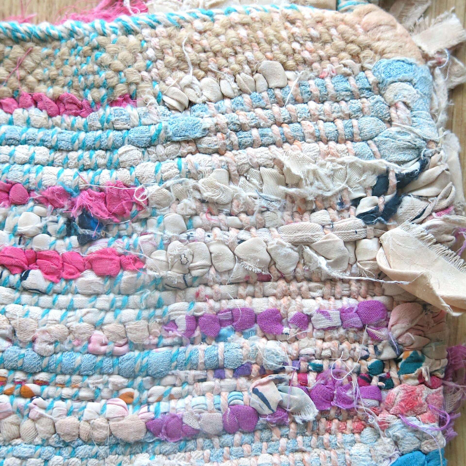 Es handelt sich um eine Art Flickenteppich, der üblicherweise aus Stoffresten geknüpft wird. Die Oberfläche ist dann wie bei einem Flokati Teppich mit längeren Fasern.